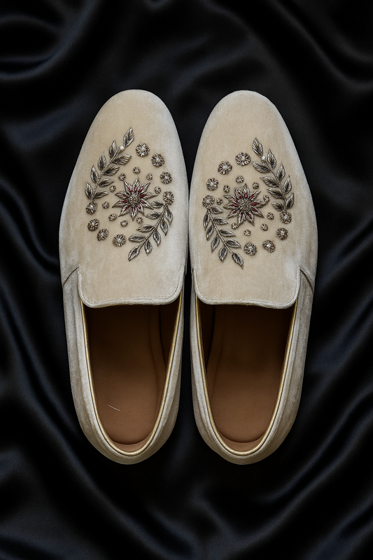 Navy Blue Velvet Slip-Ons with Gold Zardozi Embroidery