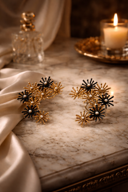 Royal Palm Motif Statement Earrings with Black Onyx & Pearl Drop
