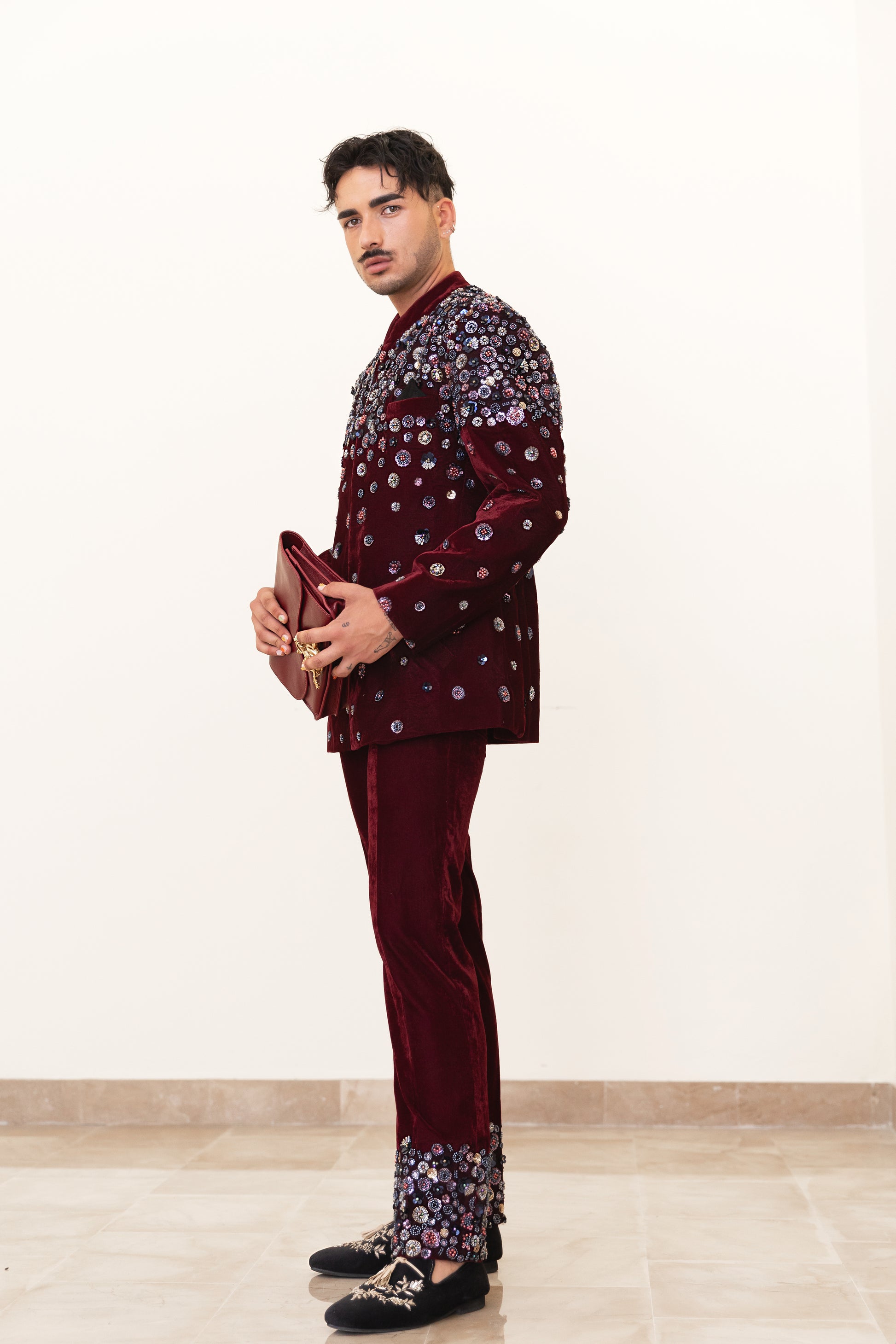 Paired with matching velvet trousers, this set embodies elevated couture menswear. Every detail reflects meticulous craftsmanship and expressive design, making this ensemble a standout choice for those who value individuality, precision, and unmistakable presence.