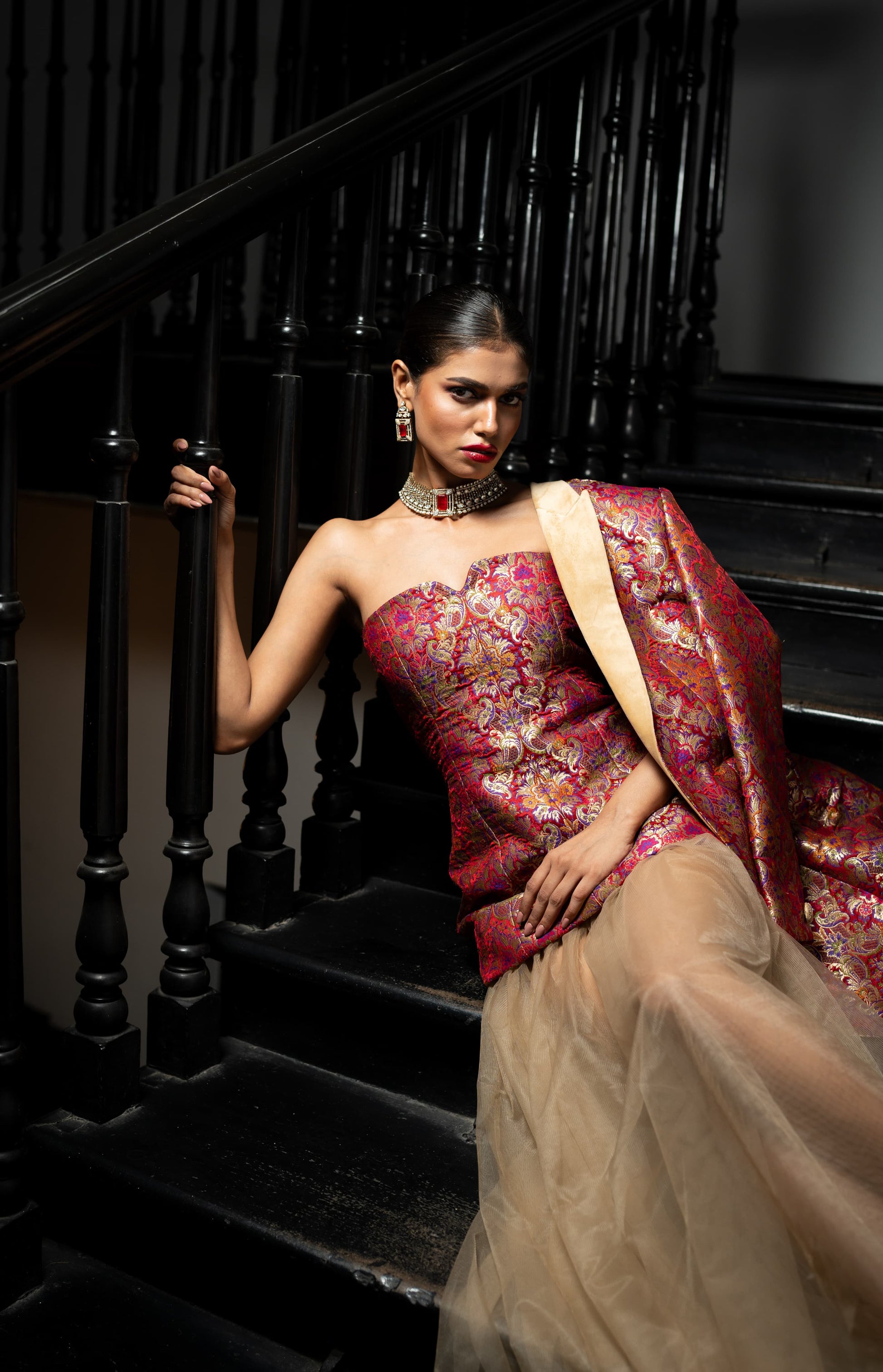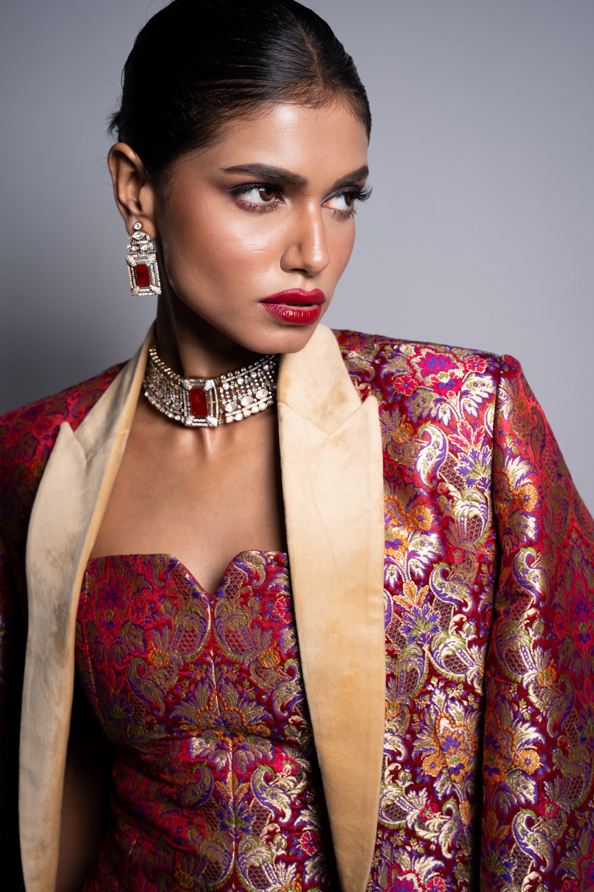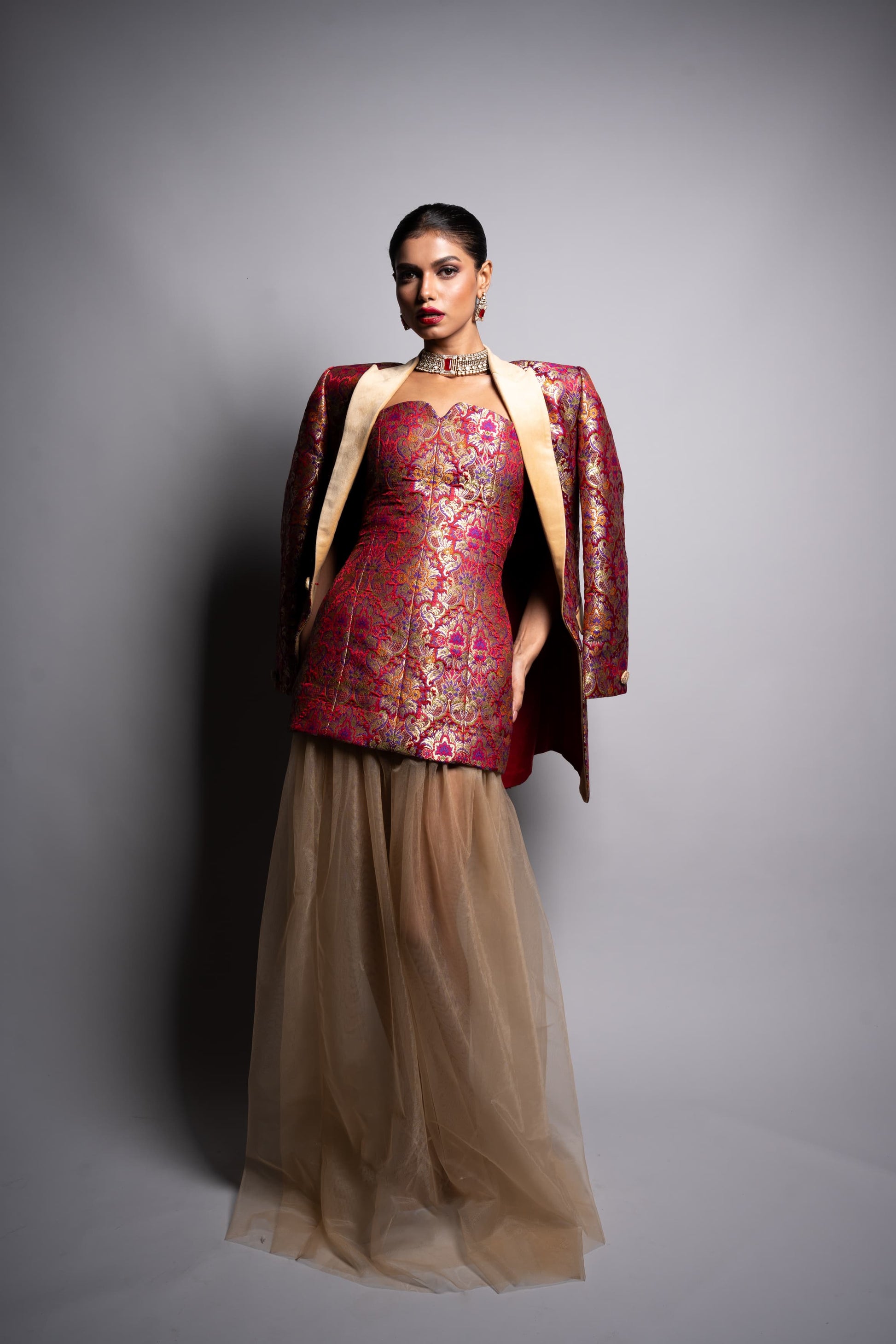 Bringing the East and West together in one silhouette this crimson brocade evening dress and blazer truly define Indian couture. The fabric features several traditional woven motifs and bring together a colourful collage, almost like a celebration of life. The chic outfit features a detachable tulle skirt for a quick style change!