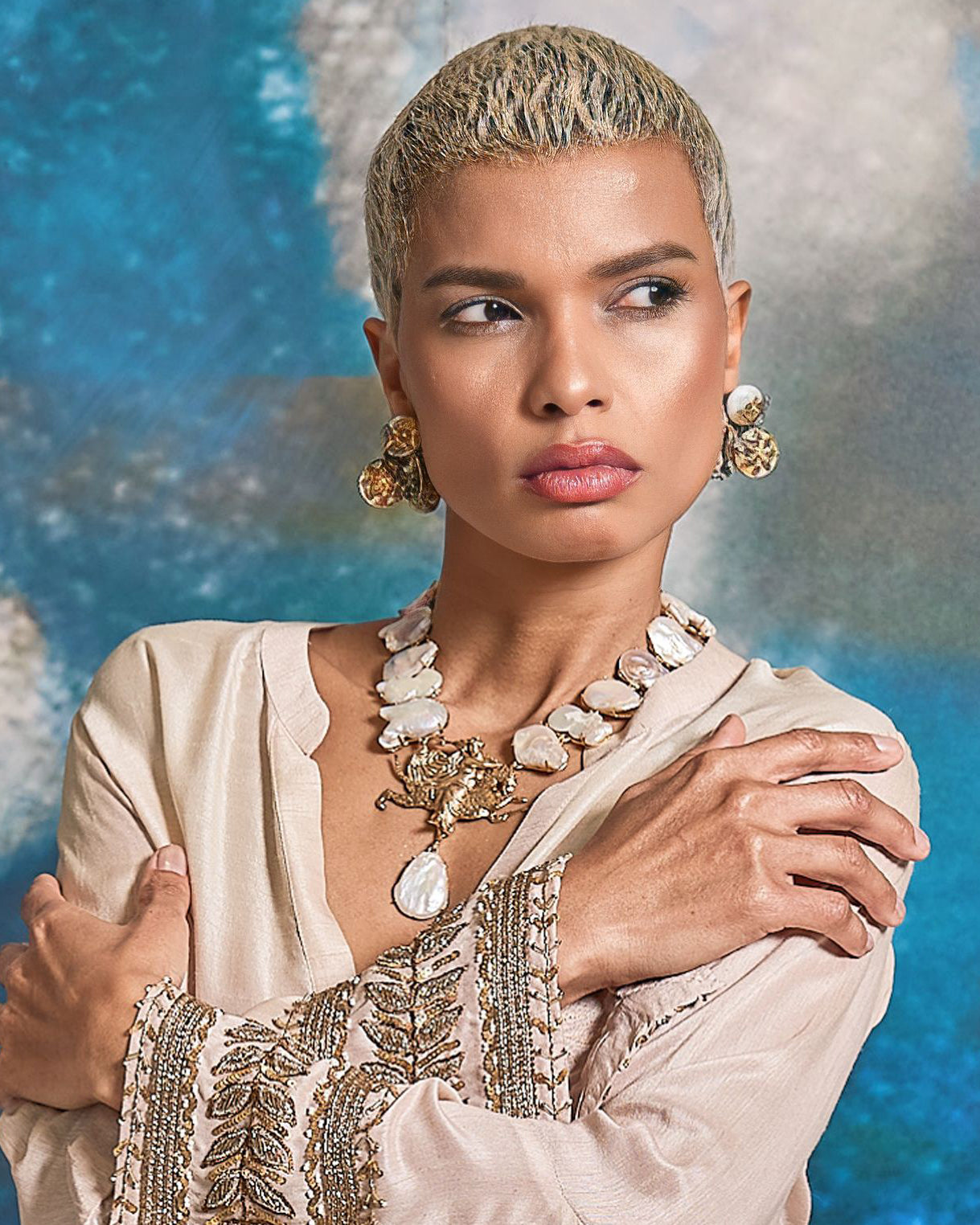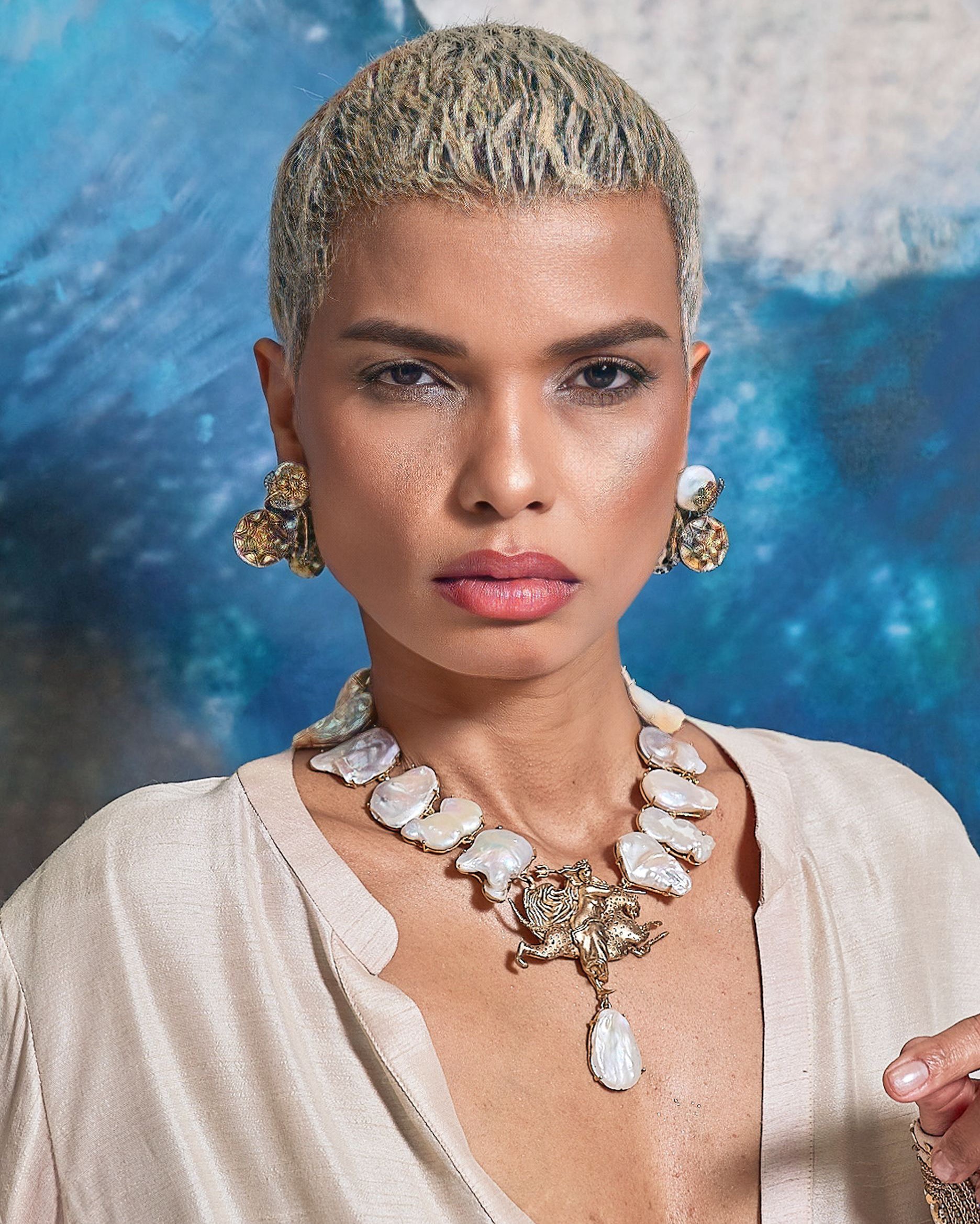 Dalmatian stones earring with kundan crystal and baroque pearl.