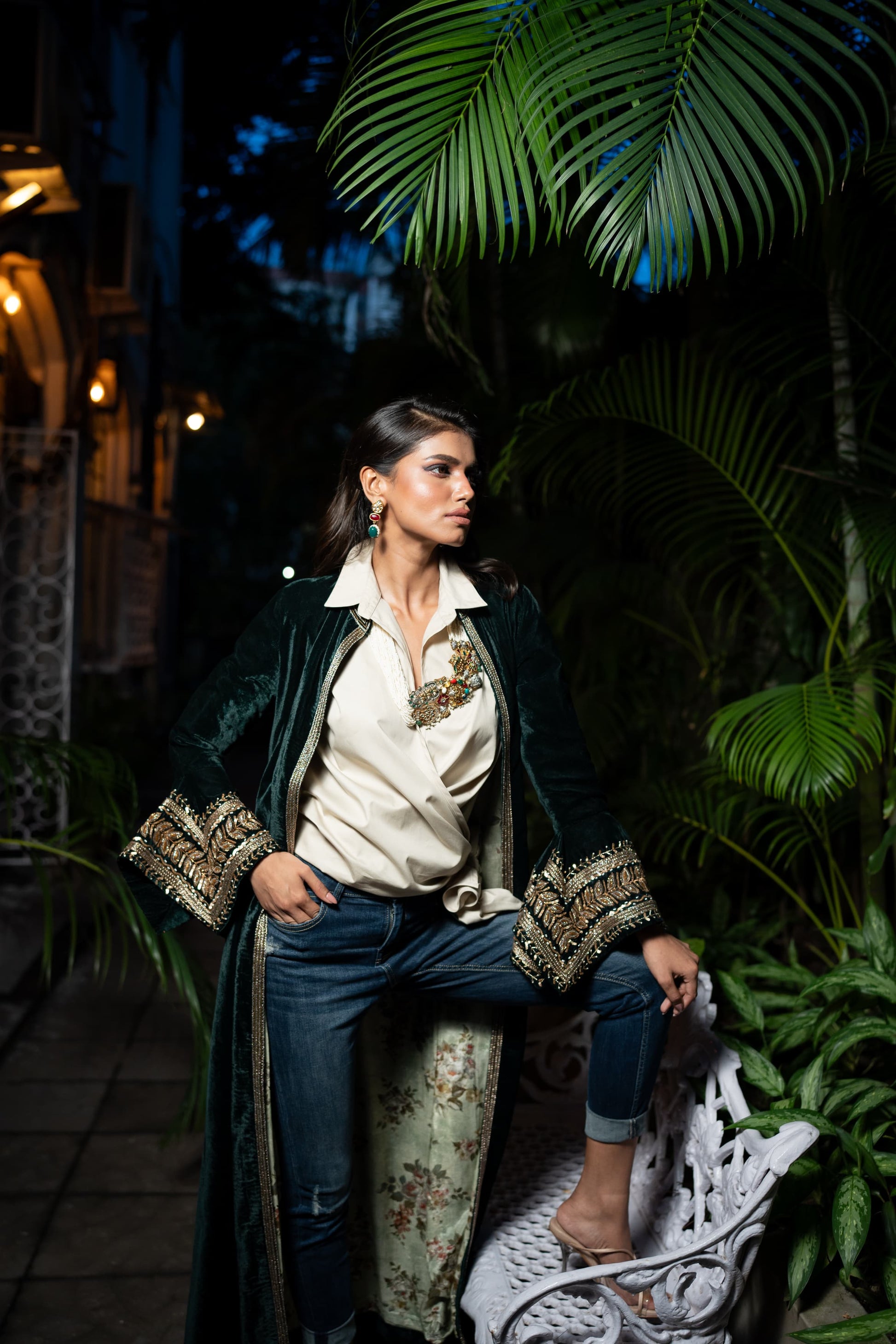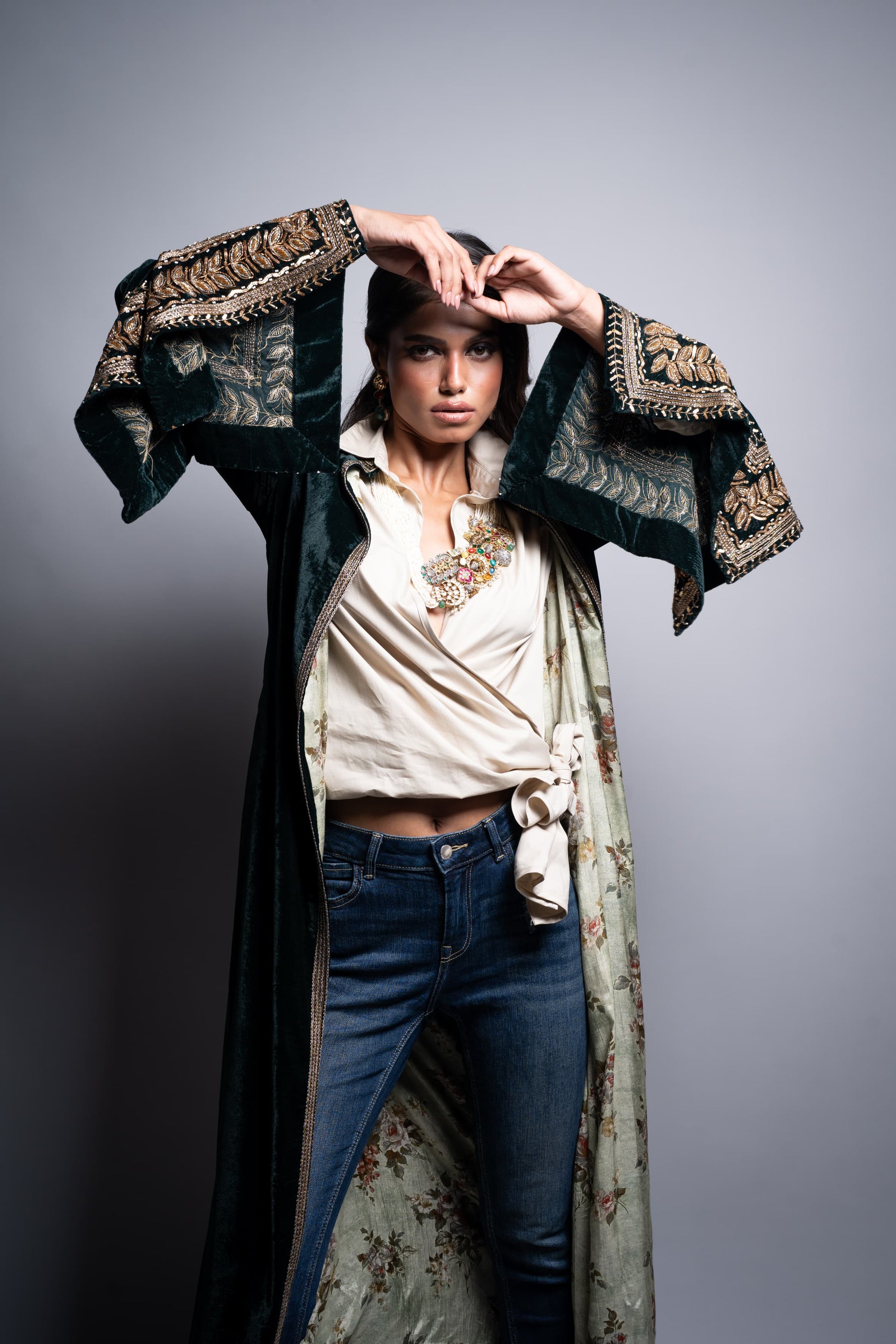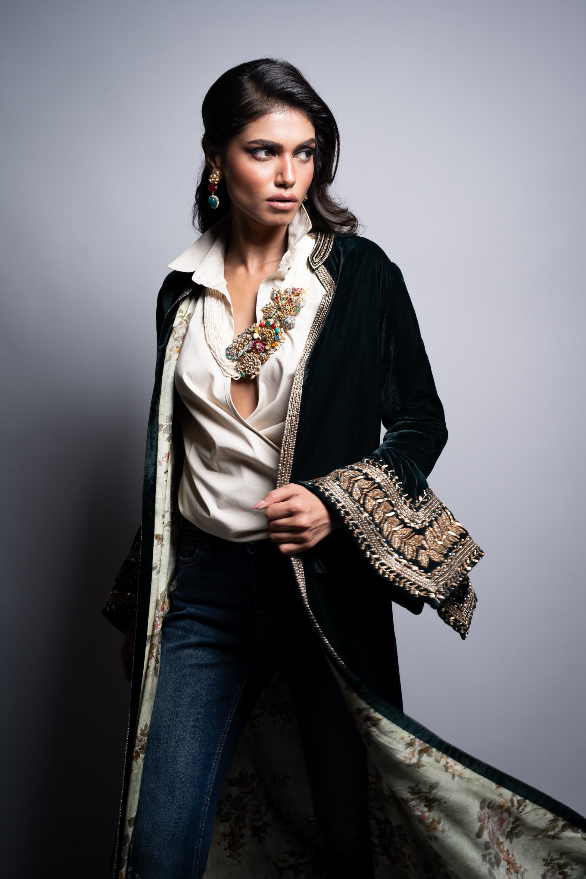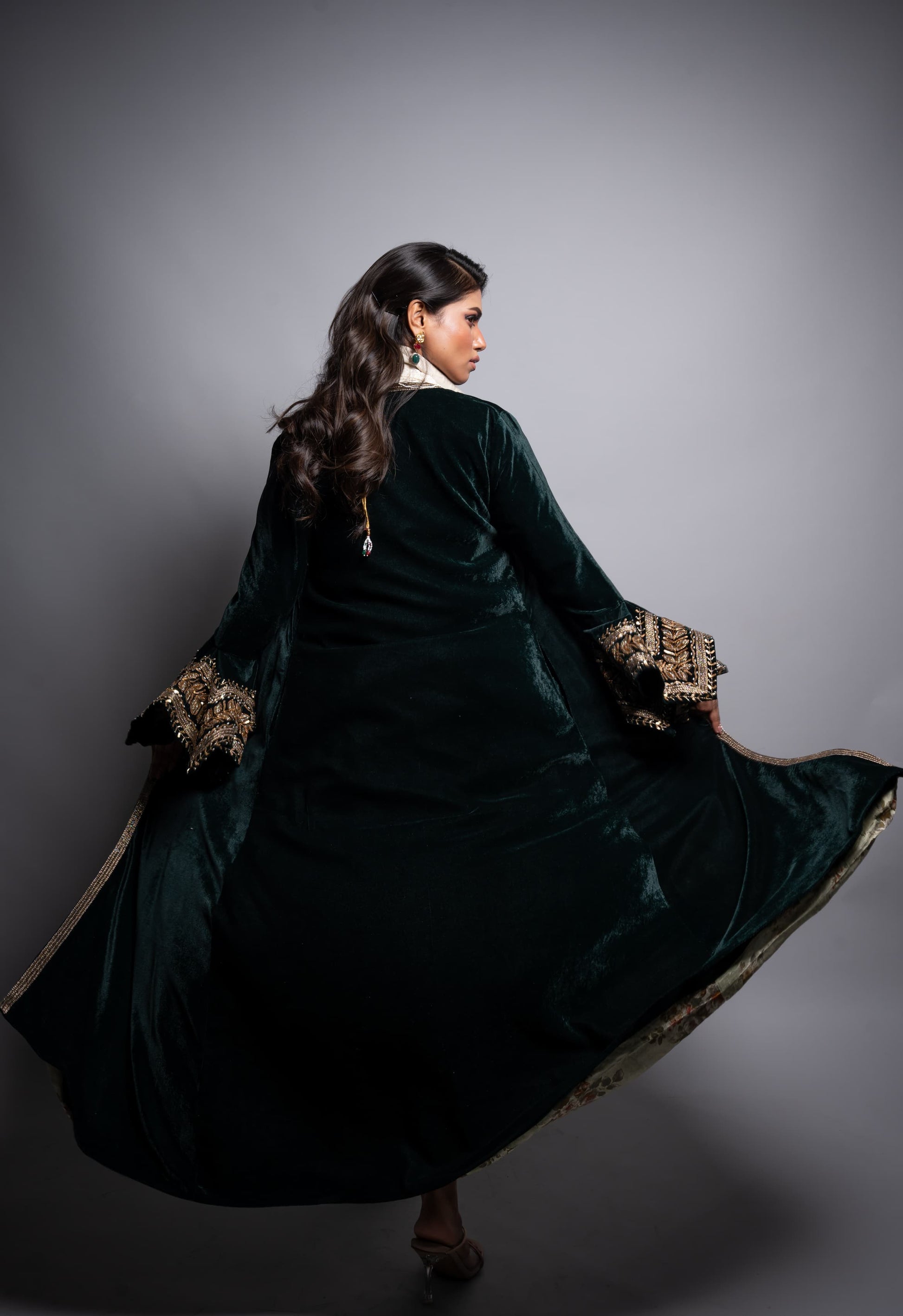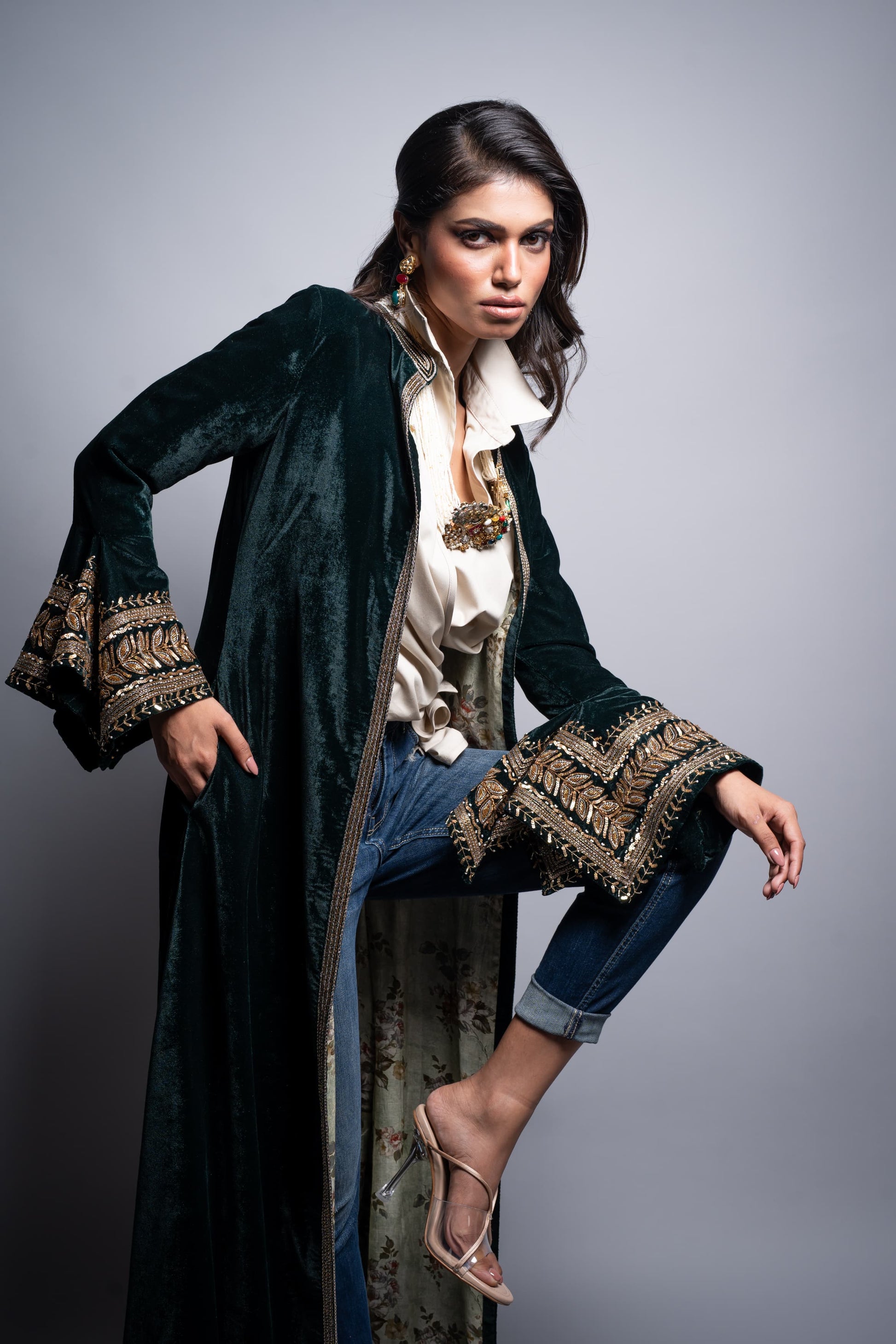 Emerald green velveteen jacket with hand embroidery on the rumal sleeve and along the front of the jacket. Made with extreme care and detail by hand craftsmen taking over a 100 man hours to complete the embroidery. The jacket has an exquisite printed silk lining.