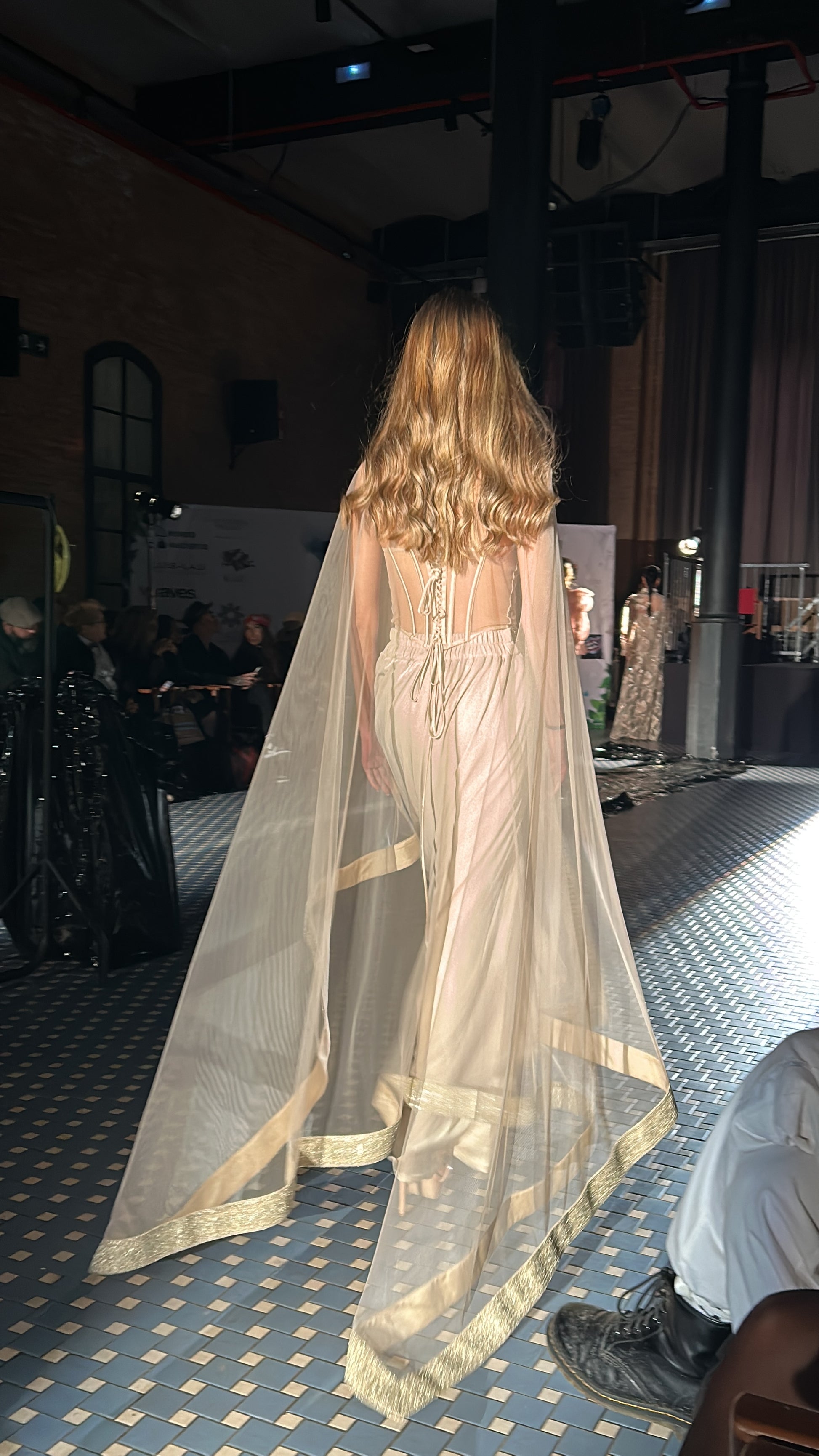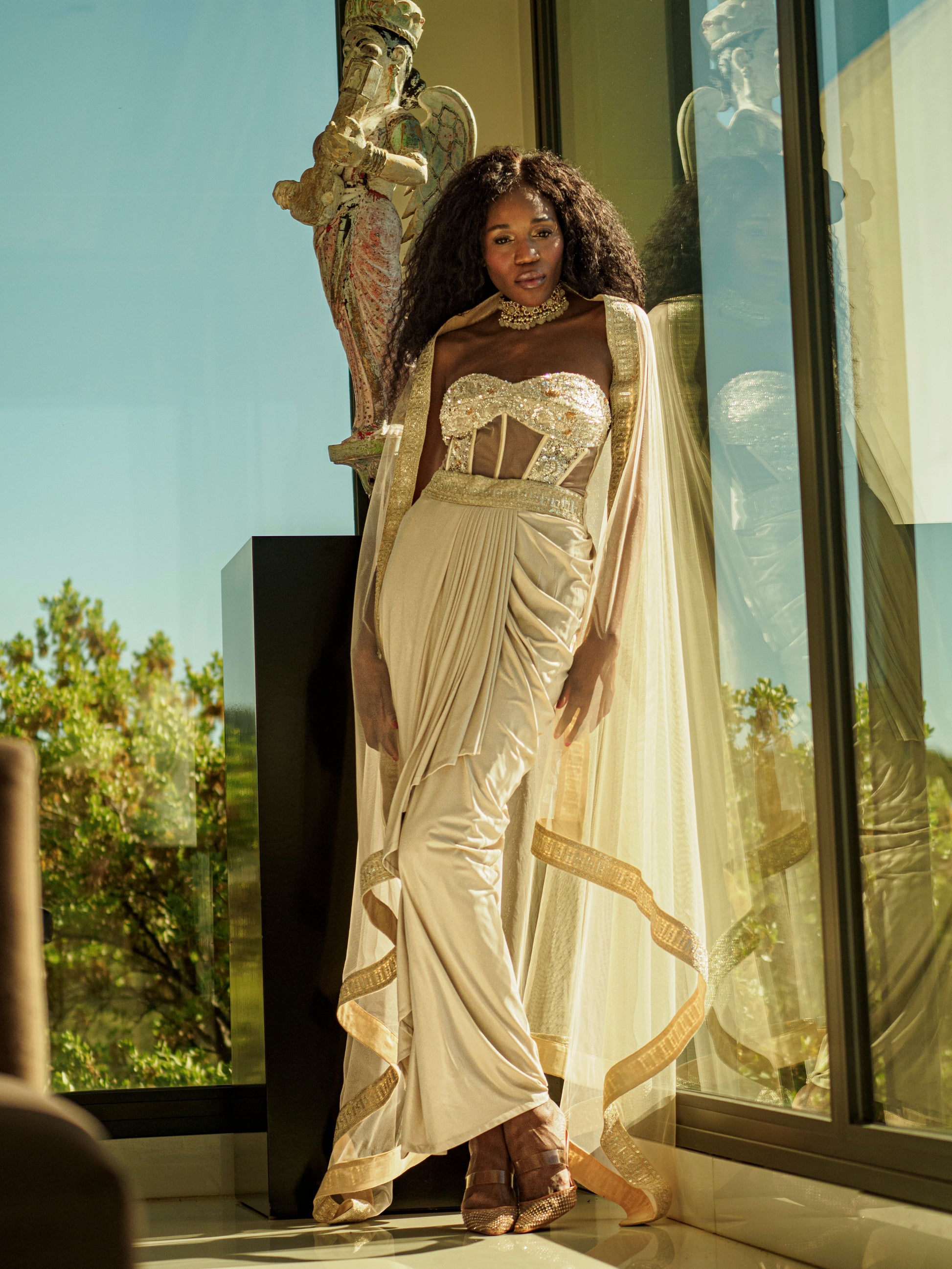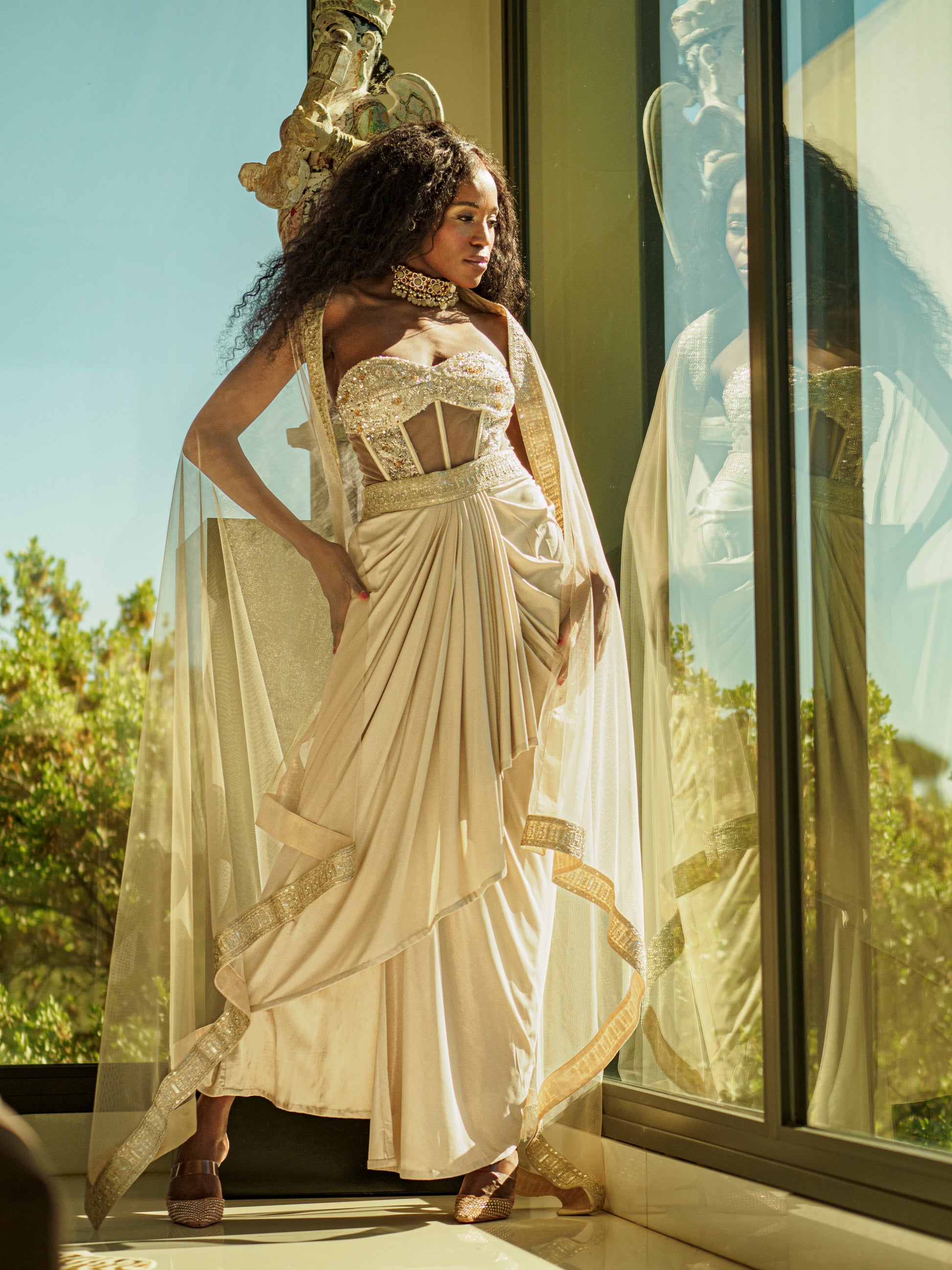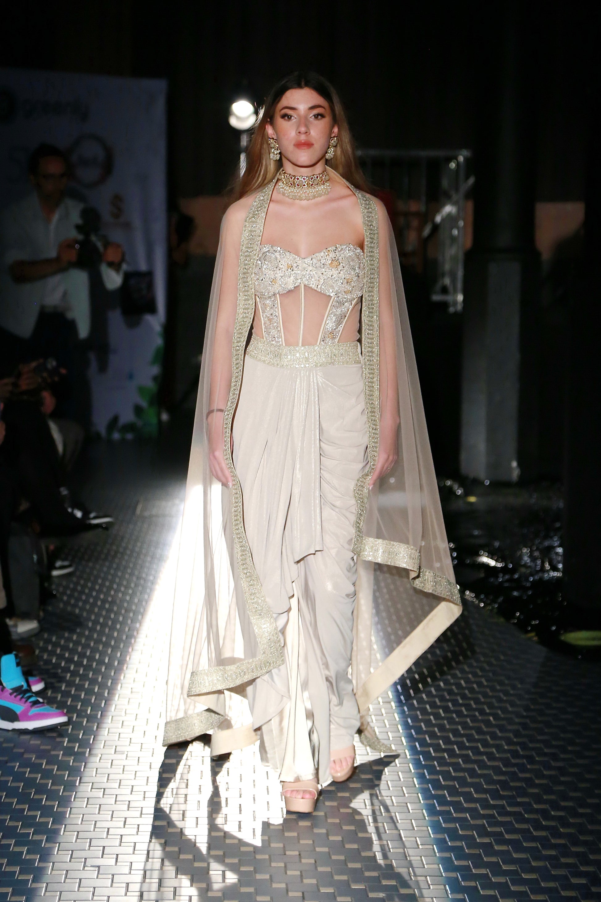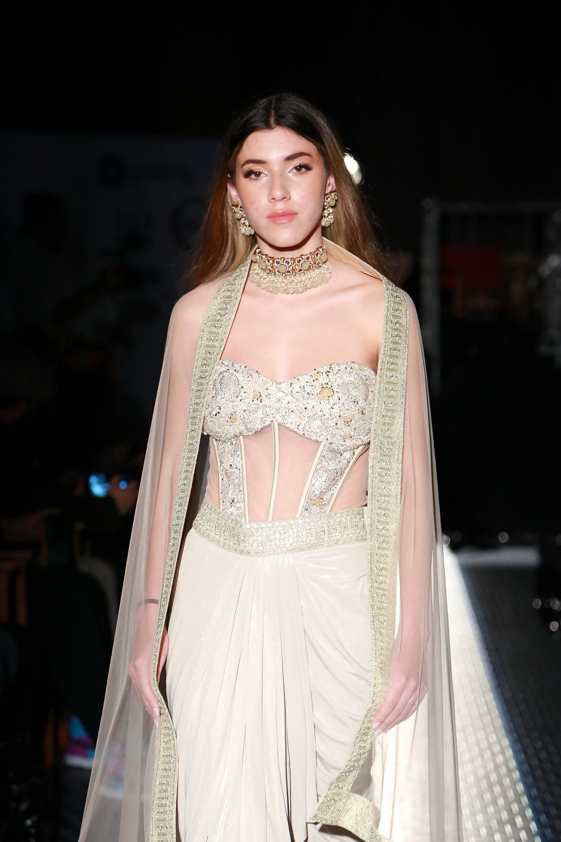 Indo Western Classic Saree Skirt with a Tulle Corset and a Tulle Veil - An Indo western classic saree skirt paired with a delicately hand embroidered for about 82 hours tulle corset and a tulle veil. Lycra, silk satin as lining and tulle come together to create this three piece look.