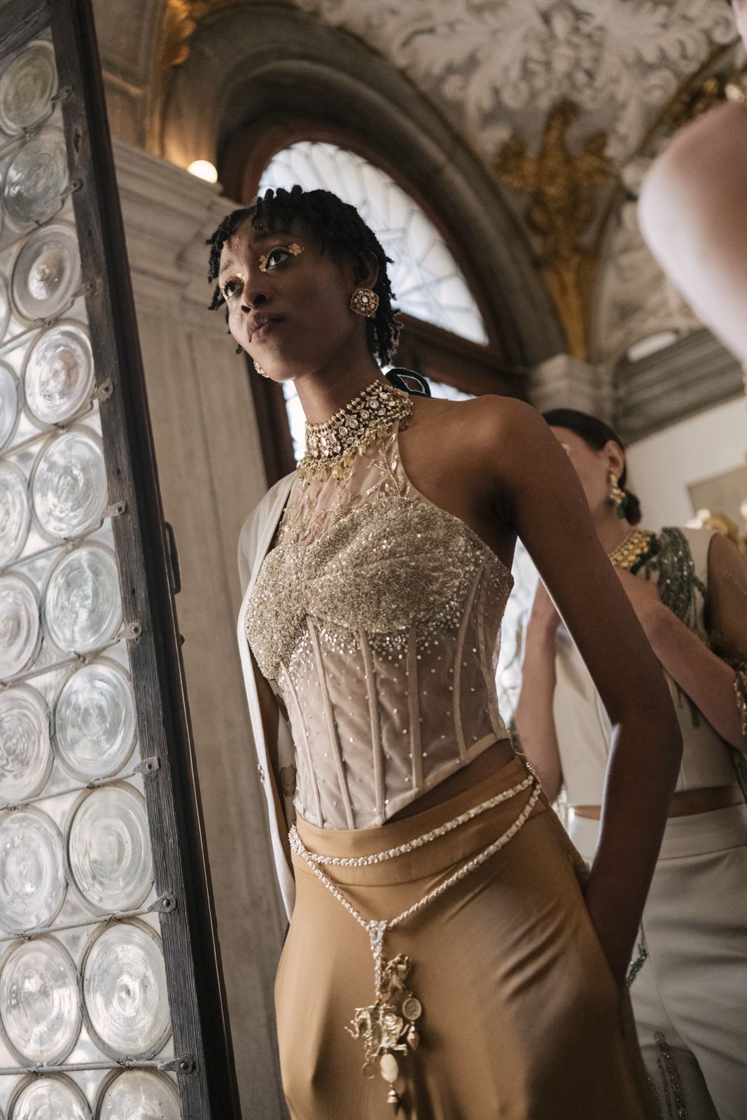 Silhouette: Fitted halter corset accentuating the waist; voluminous lehenga skirt and draped shawl for balanced fluidity.