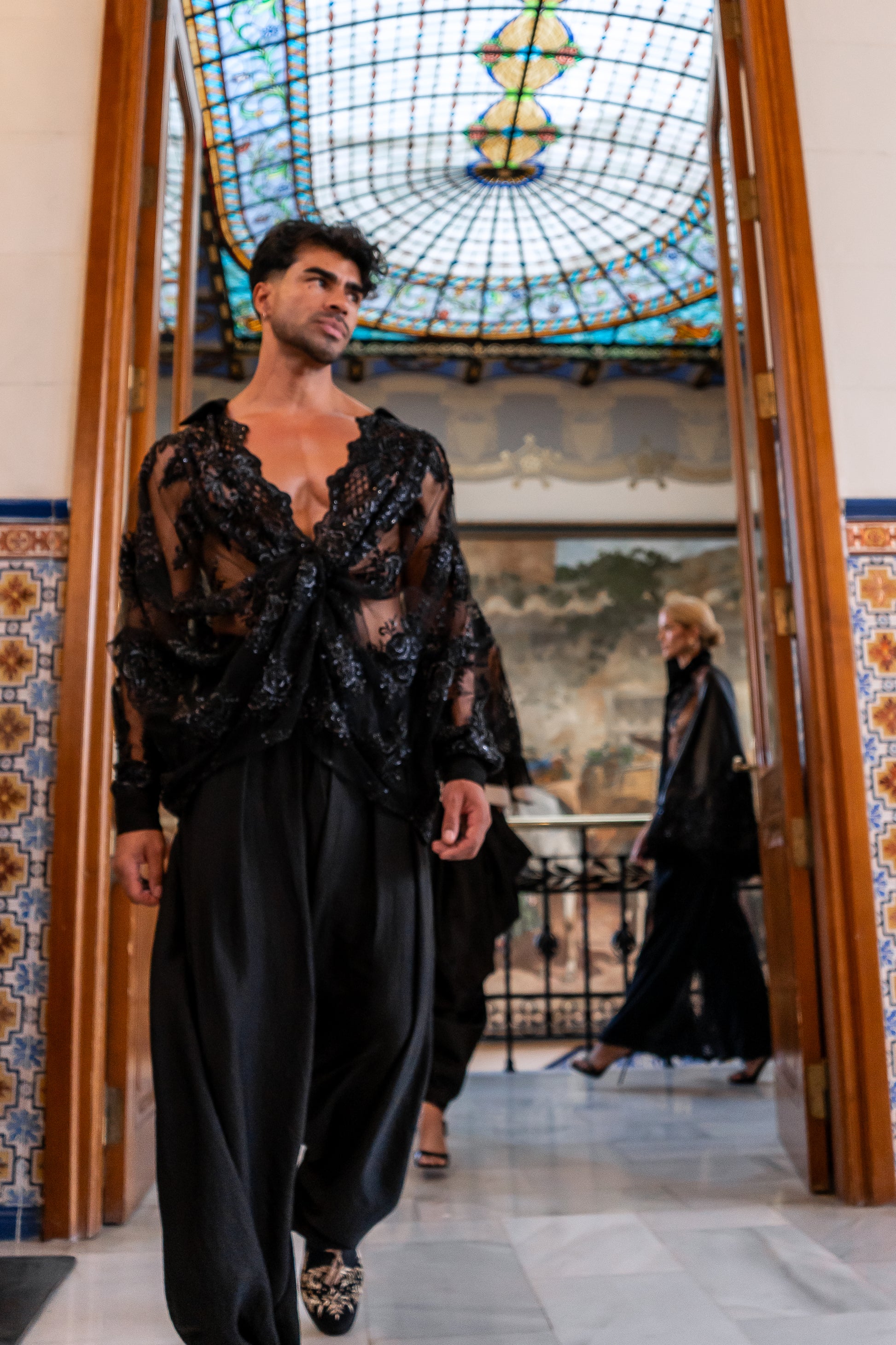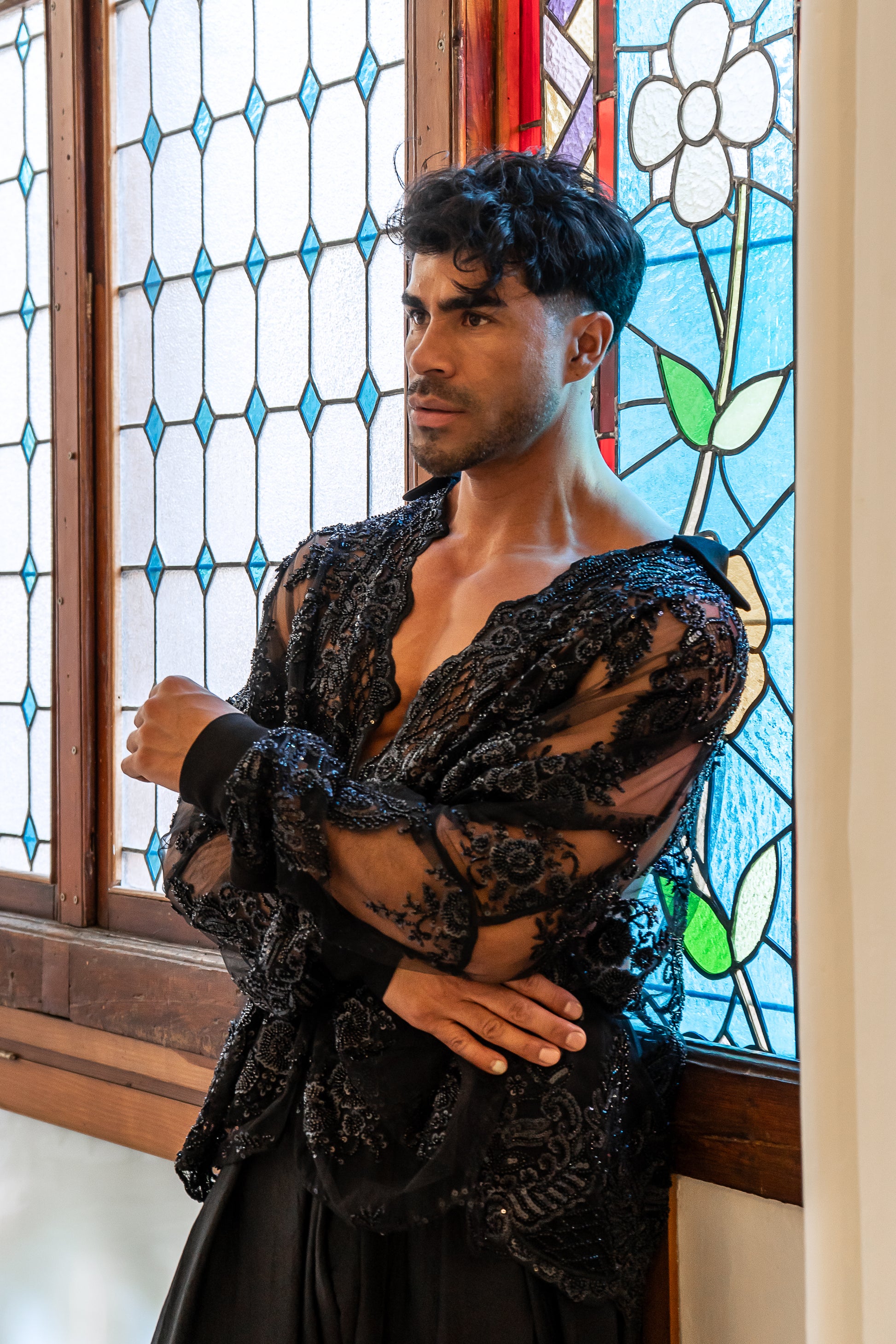 Paired with fluid black satin dhoti pants, the ensemble encapsulates modern luxury with effortless movement and comfort. The pants’ relaxed drape contrasts the intricate top, achieving a balanced silhouette ideal for soirées, editorial events, runway-inspired evenings, and destination celebrations. This look is crafted for the man who leads with charisma and embraces couture as a form of identity.