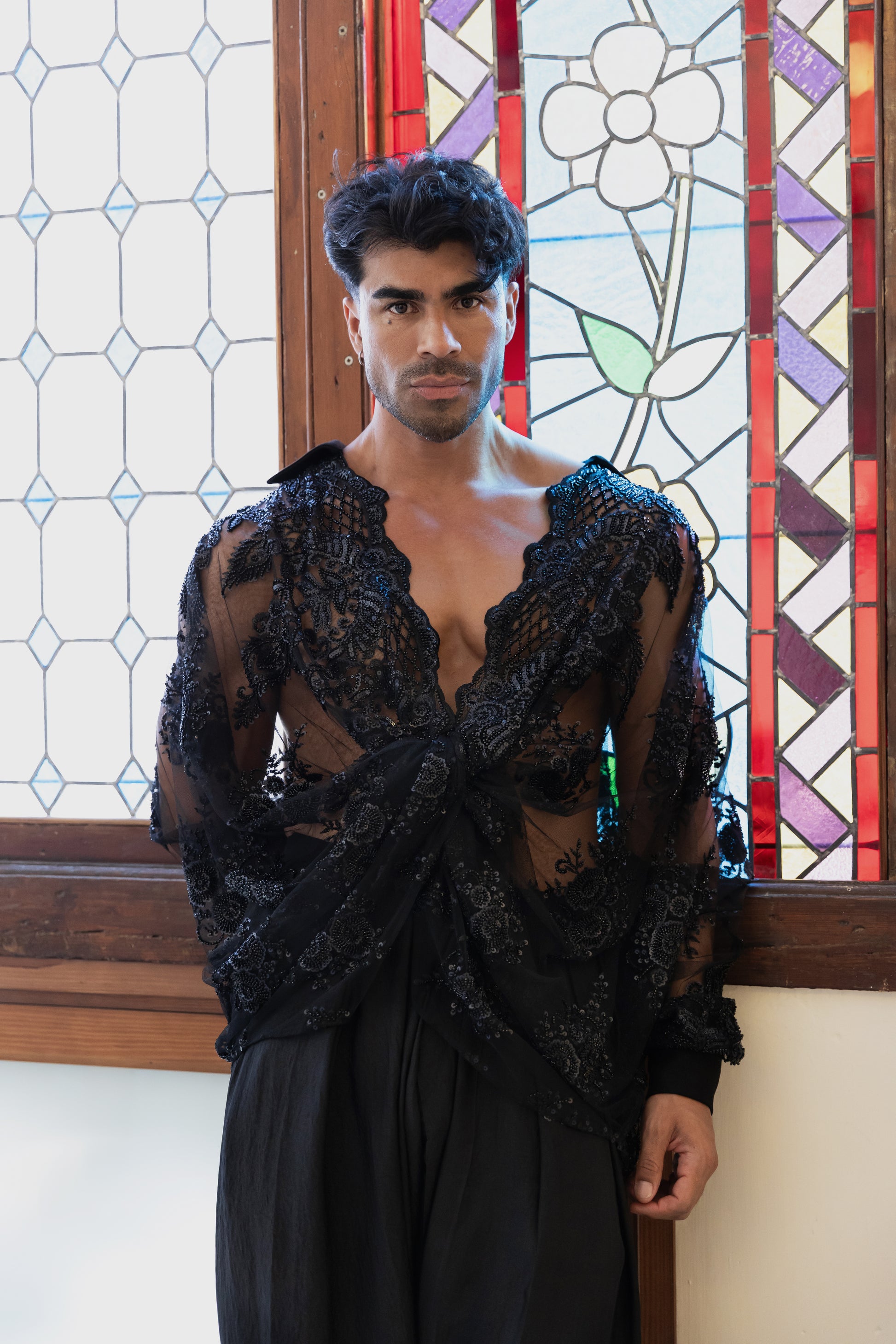 The Men’s Black Sheer Embroidered Net Shirt and Black Satin Dhoti Pants set is a dramatic fusion of contemporary styling and artisanal detail. The sheer embroidered net shirt features intricate bead and thread embellishments that form expressive patterns across the body, creating an almost sculptural visual texture. Its soft drape and deep neckline add a bold, confident edge, offering a refined yet daring aesthetic suited for high-fashion moments.