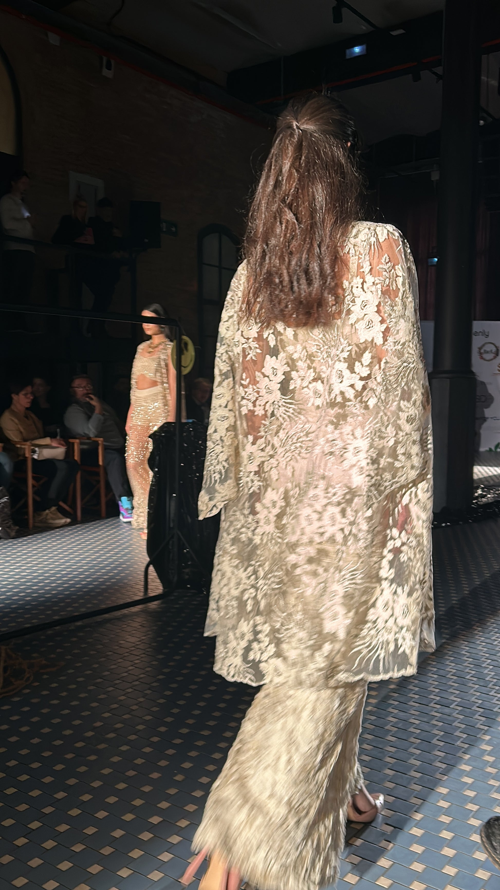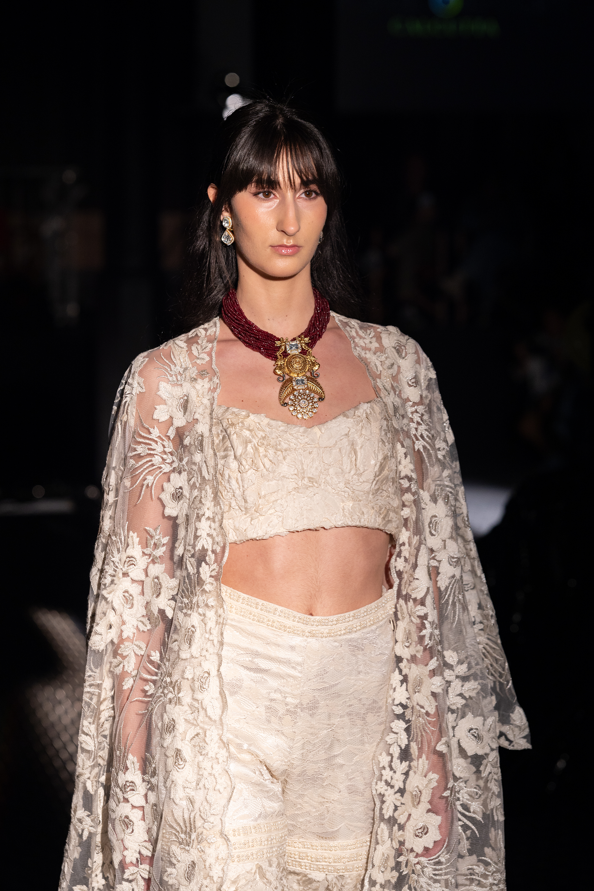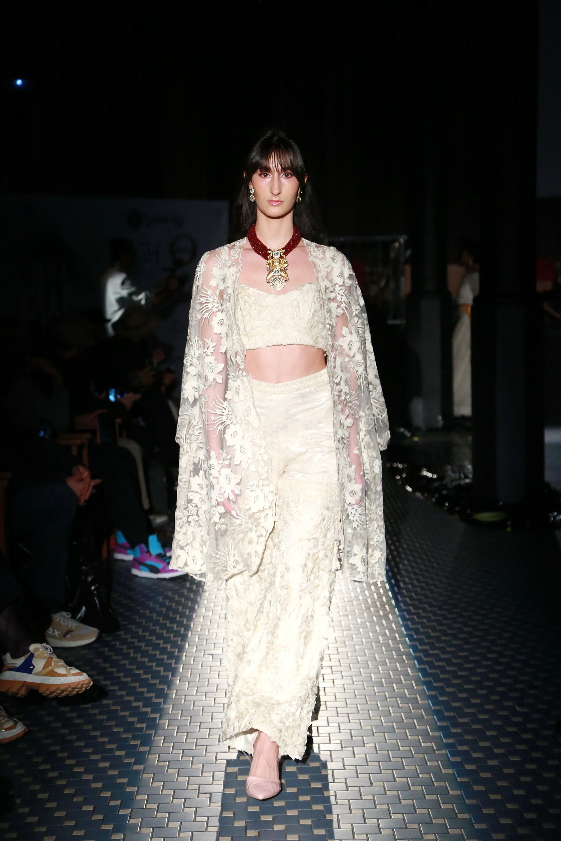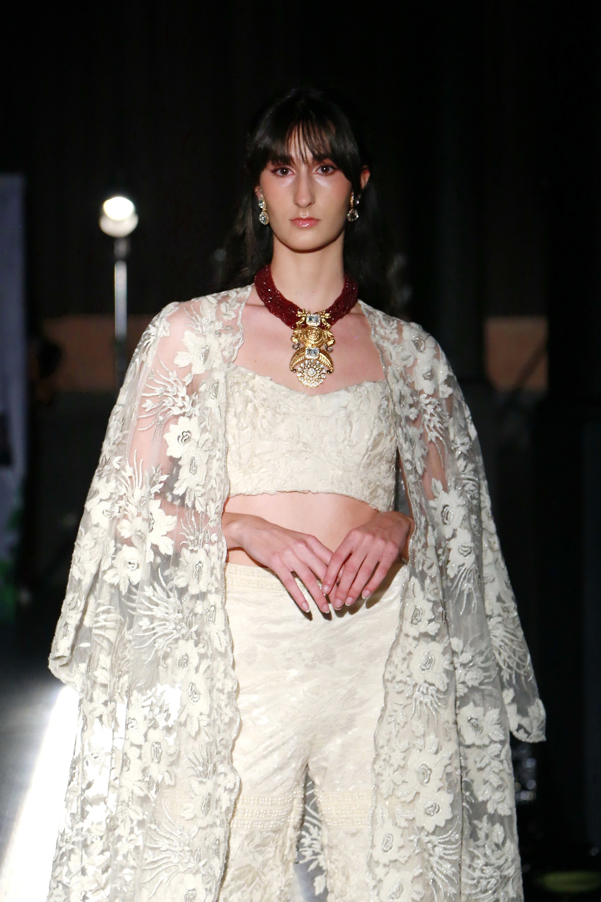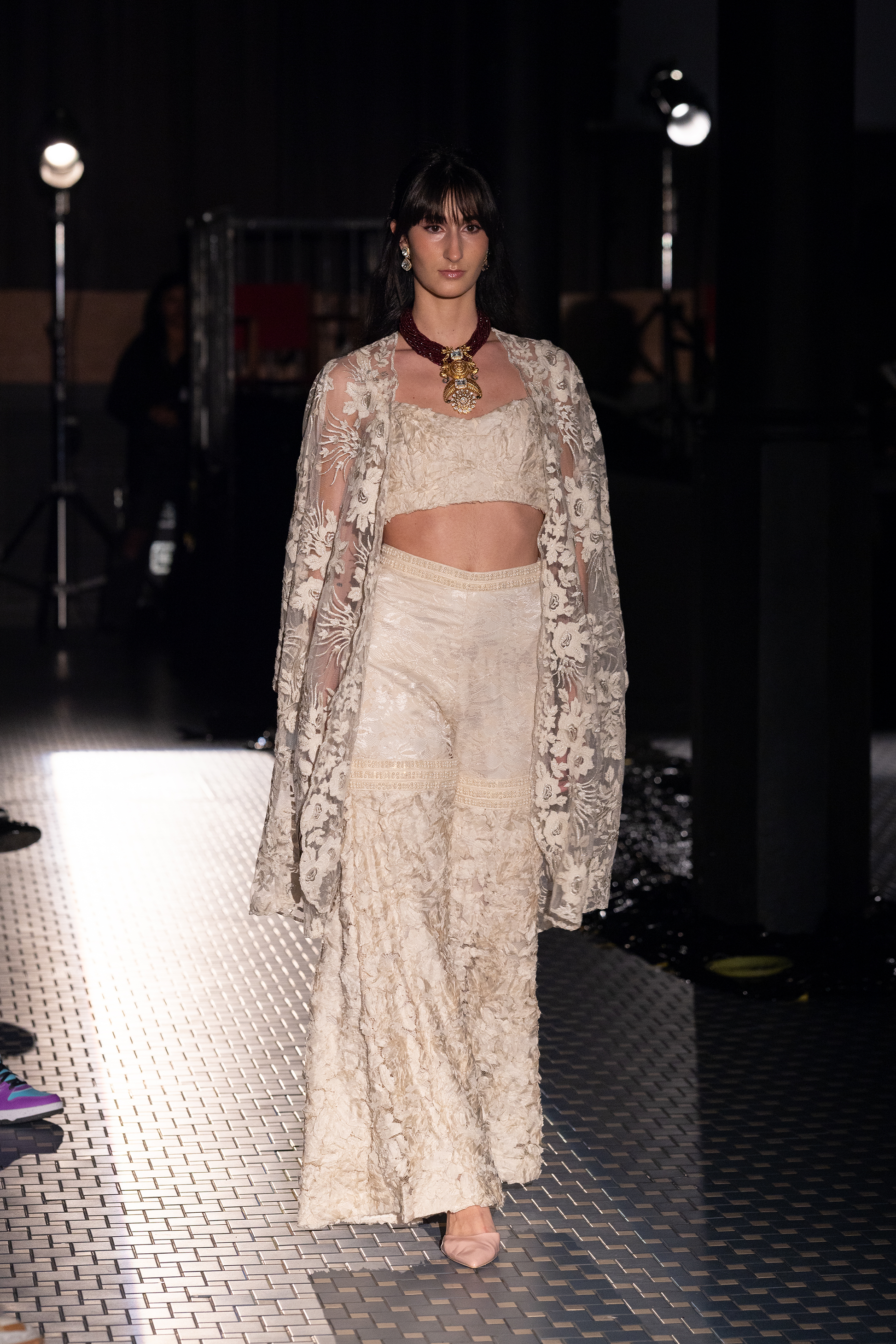 A three piece suit, a bustier top paired with flared pants ,highlighted with a flower motif jacket.