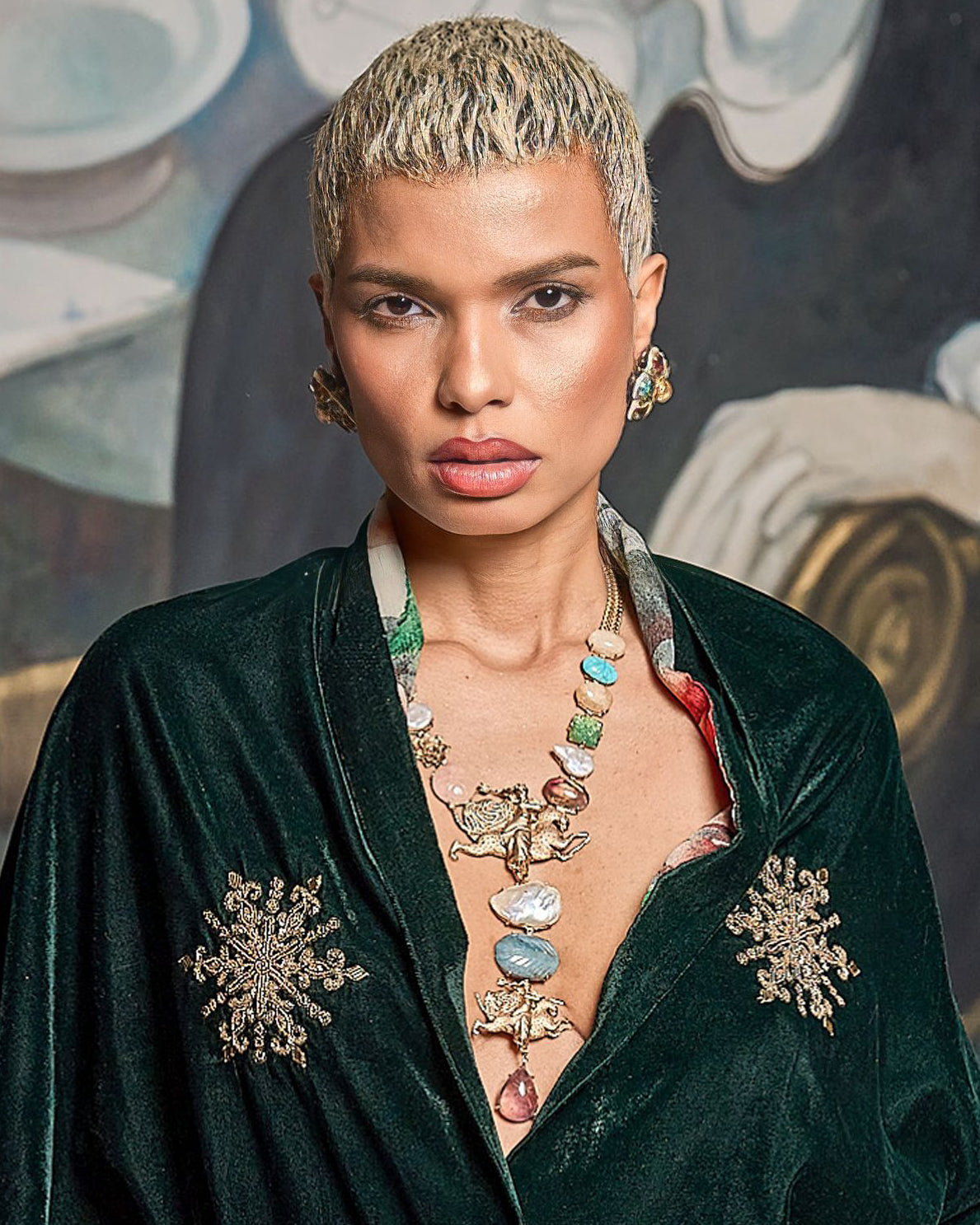Madame Sibarita logo necklace with mother of pearl and natural stones.