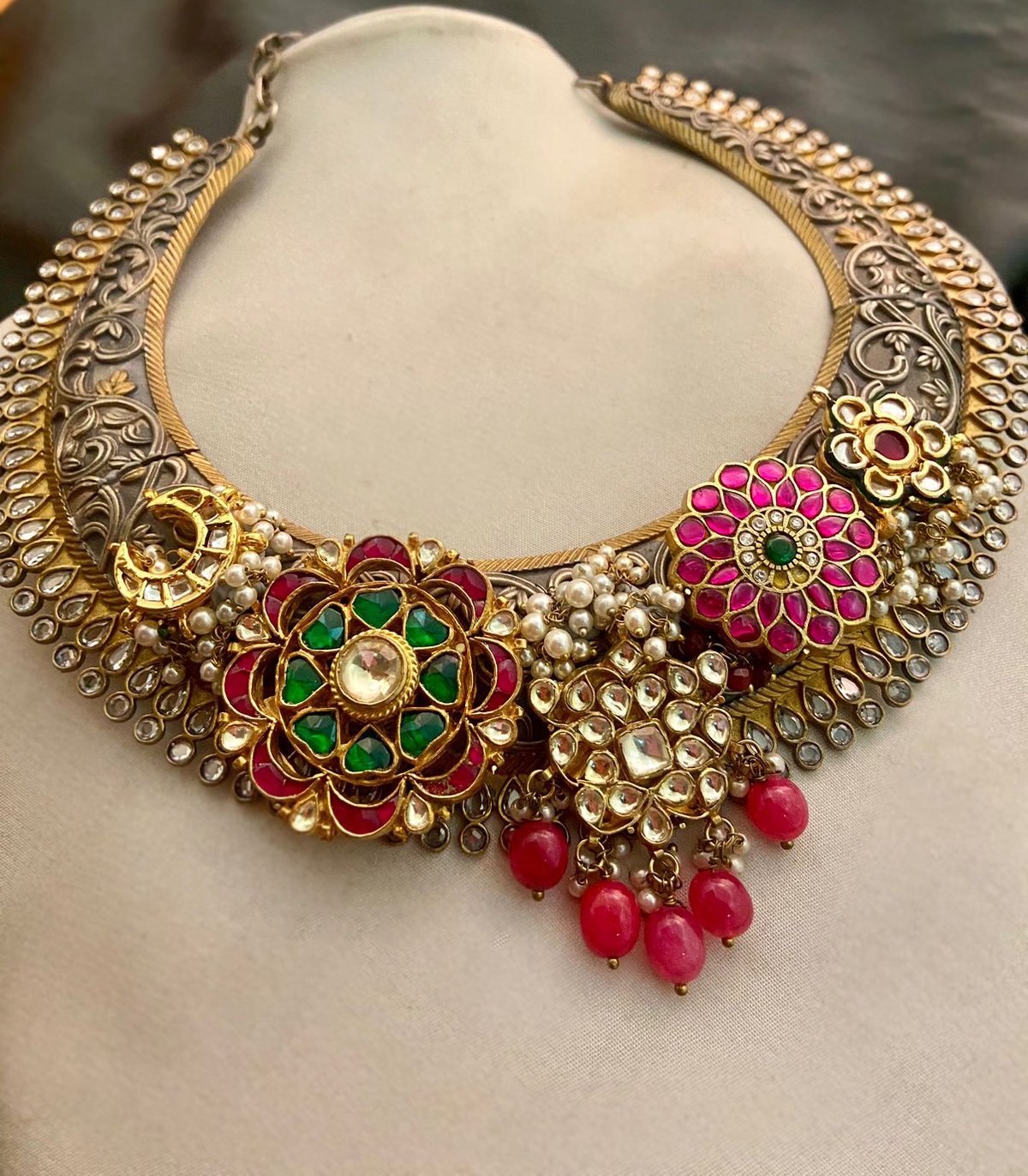 "Noor Necklace" an antique silver finish necklace with kundan motif on it, finished with ruby coloured beads.