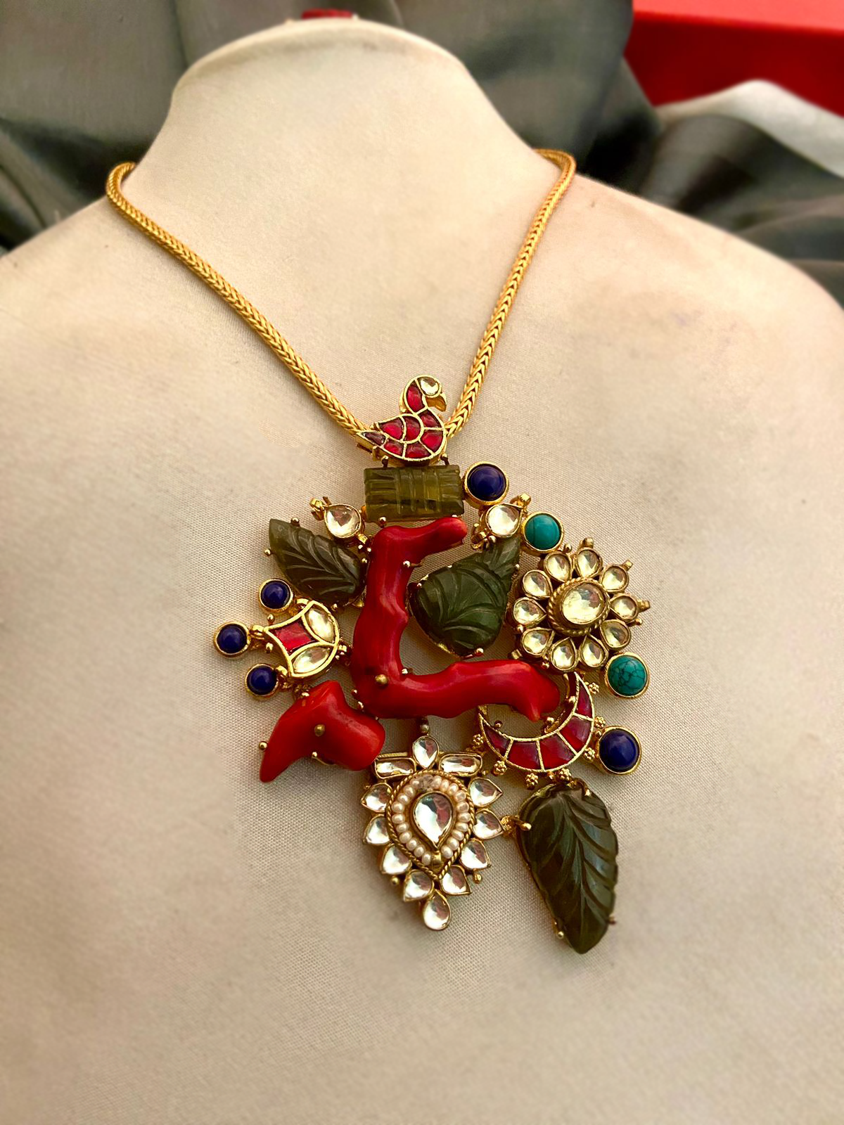 The Rist of colours pendant with coral, turquoise & vesonite stone detailing & kundan crystal embellishments.
