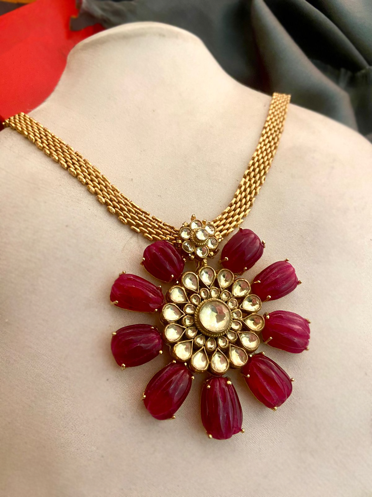 The Royal ruby pendant with carved ruby stones and kundan crystal detailing.