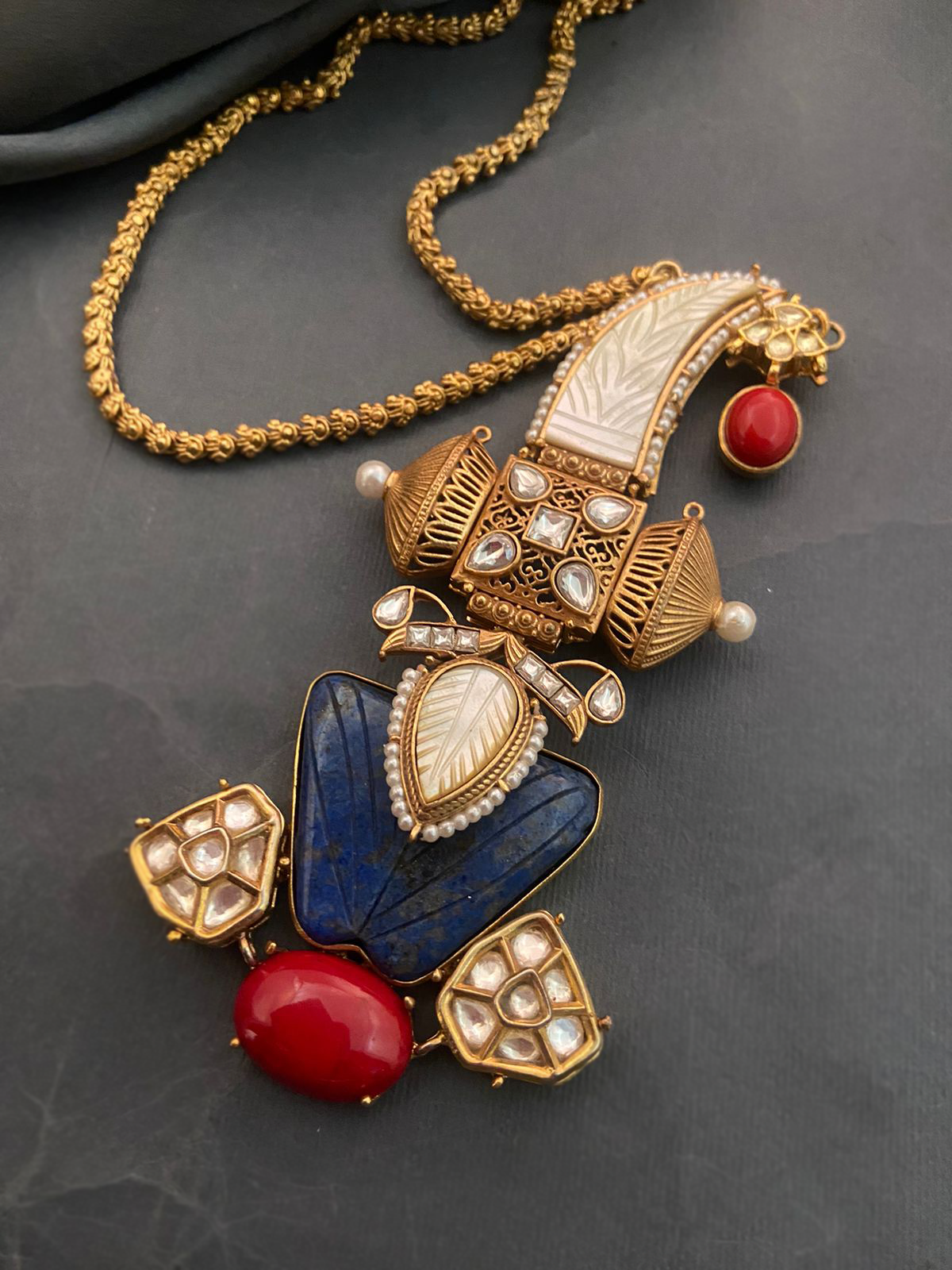 Featuring a gold finish long necklace studded with mother of pearl, lapis stone and kundan polki, set in mixed metal. Perfect wear for festive occasions or wedding ceremonies.