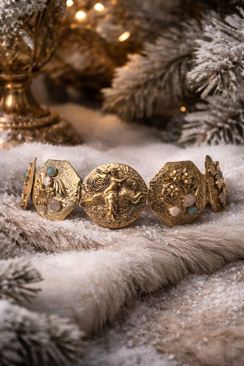 This Madam Sibarita handcrafted metal belt is a bold statement accessory, meticulously sculpted with signature metal motifs and intricate embellishments. Featuring semi-precious stones including rose quartz, jade, and baroque pearls, each element is thoughtfully placed to create a harmonious balance of texture, shine, and artisanal detail. Designed to elevate both contemporary and traditional silhouettes, the belt reflects timeless craftsmanship with a modern edge, making it a versatile luxury piece for styling over dresses, sarees, or structured ensembles. A true expression of artistry, this belt embodies elegance, strength, and individuality.