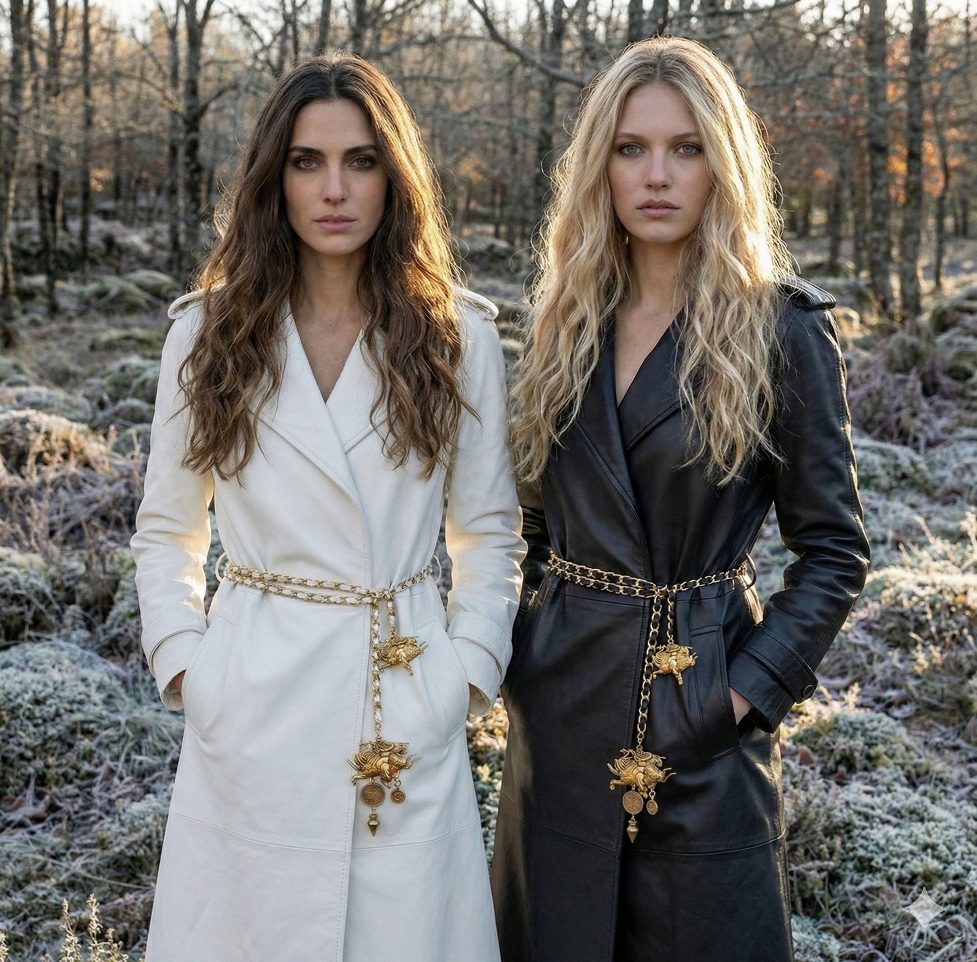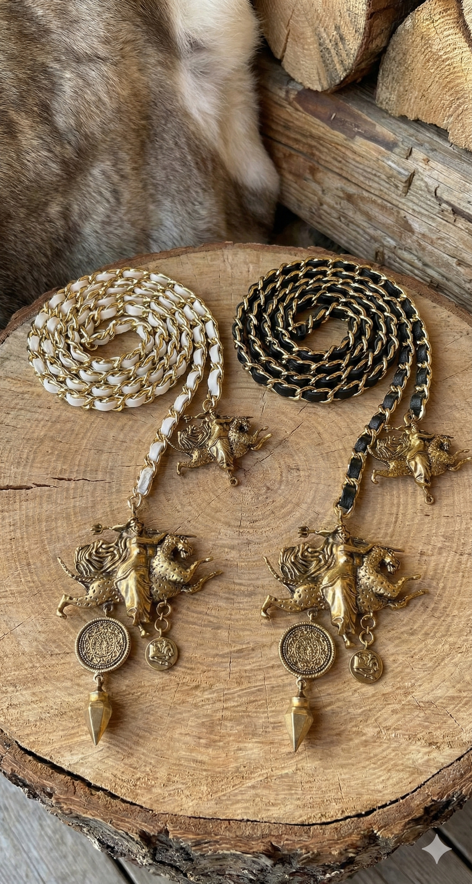 A study in contrast and craftsmanship: vegan leather chain belts, in deep black and ivory white, intertwined with gold-plated bronze. At the heart of the design, the Madame Sibarita logo—a bacchante—symbolizes freedom, passion, and celebration, giving the piece presence and meaning. Sculpted medallions echo heritage, strength, and timeless elegance. A statement of luxury that speaks quietly but powerfully.