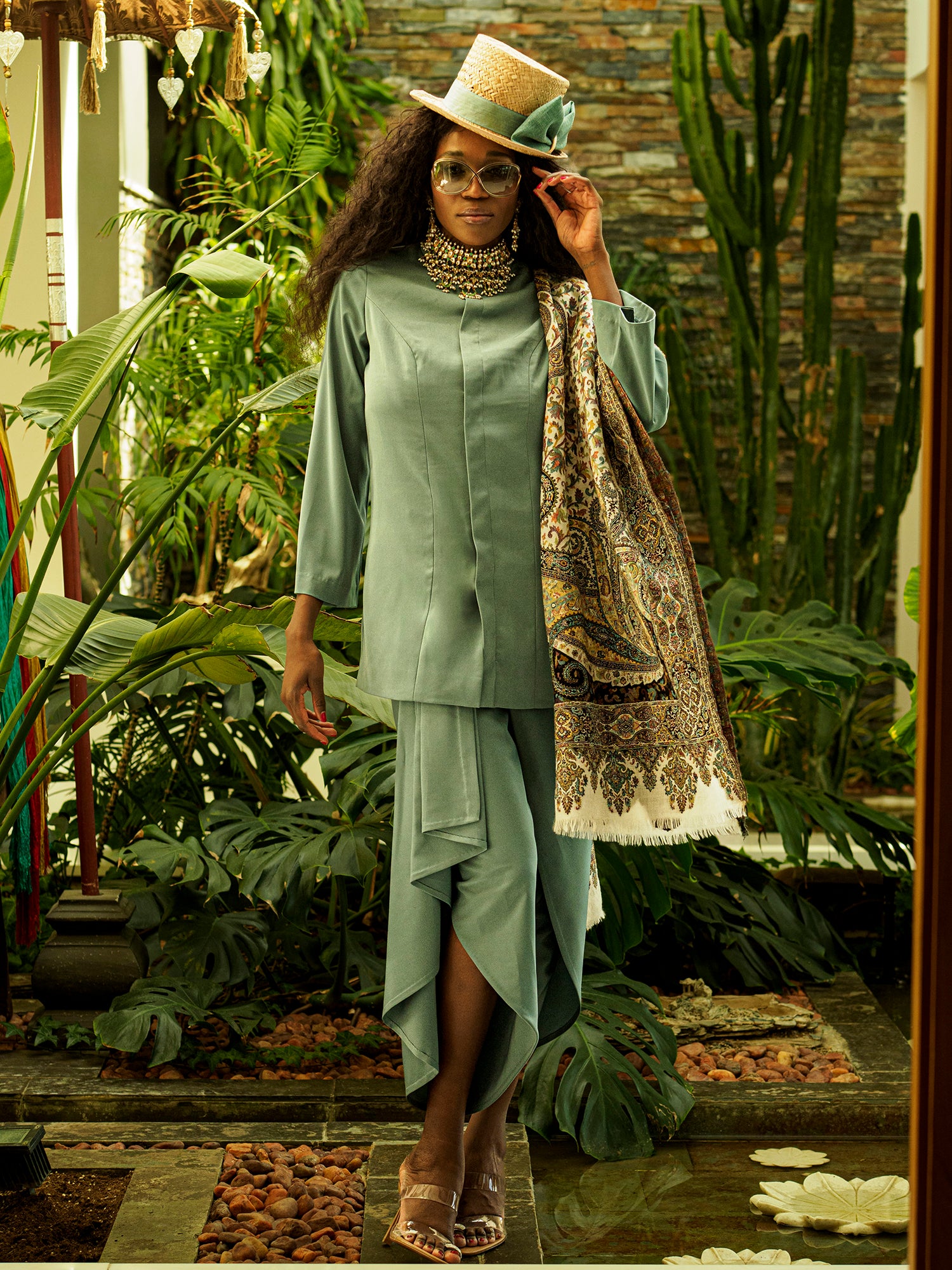 Classic Bandhgala Jacket with flared sleeve. Paired with Pleated Dhoti pants.