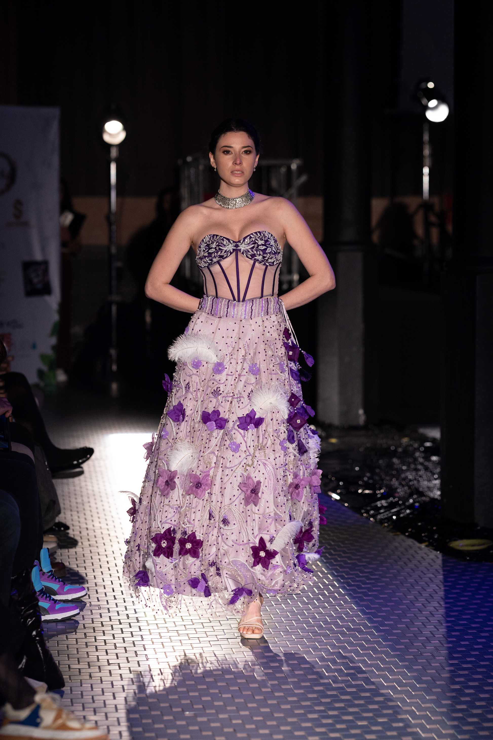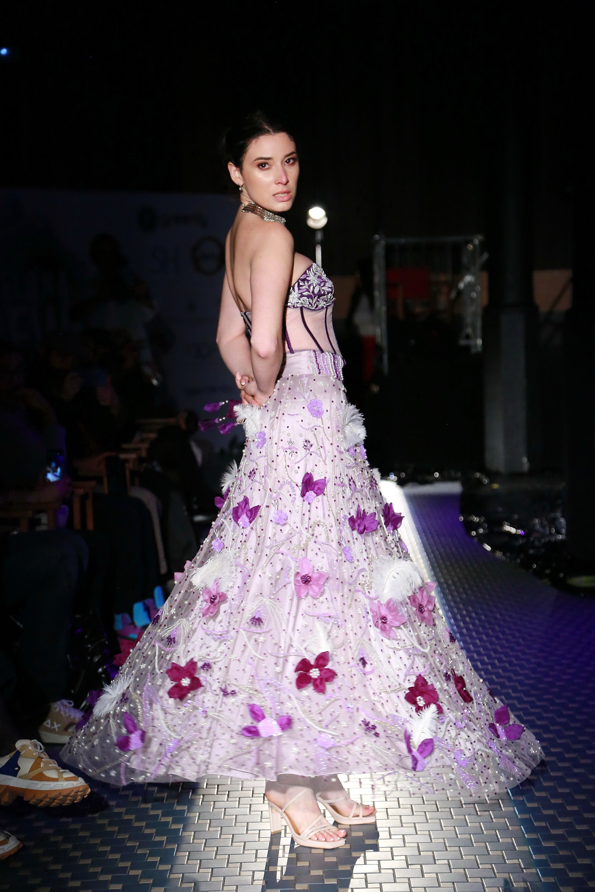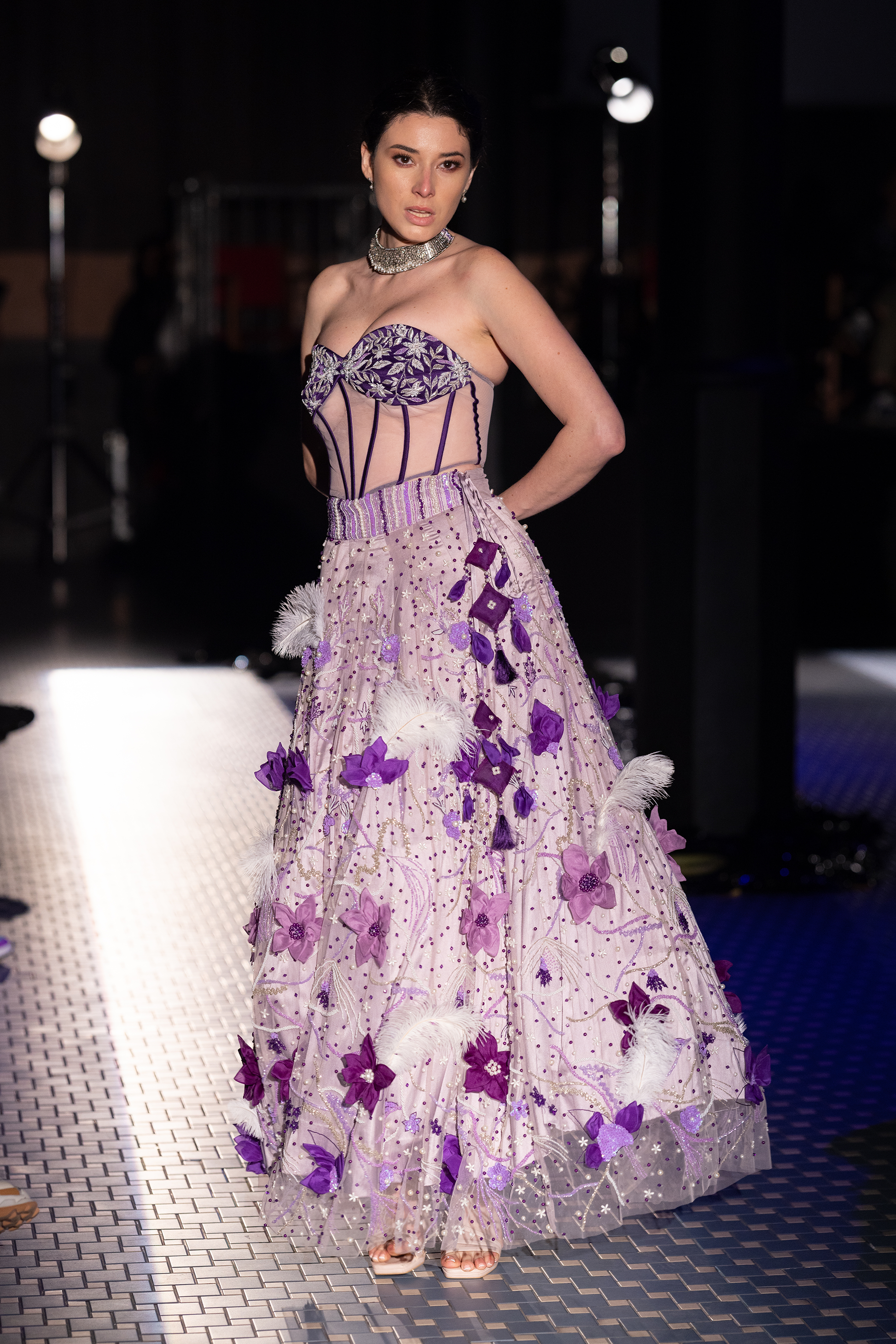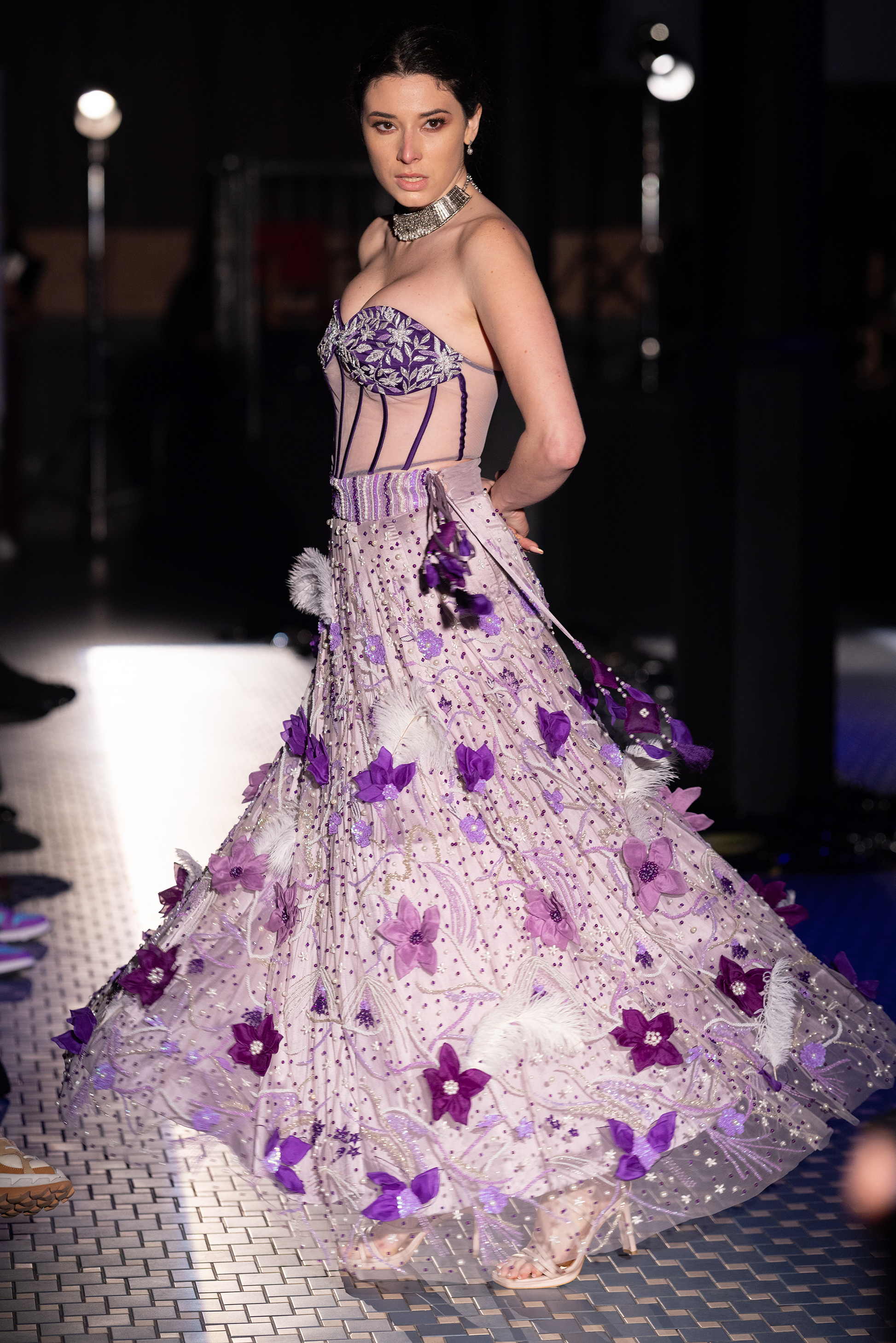 Tulle and Silk Satin Corset and Skirt - With over 350 hours of hand embroidery, this tulle and silk satin corset and skirt pair features more than a 1000 beads and pearls.